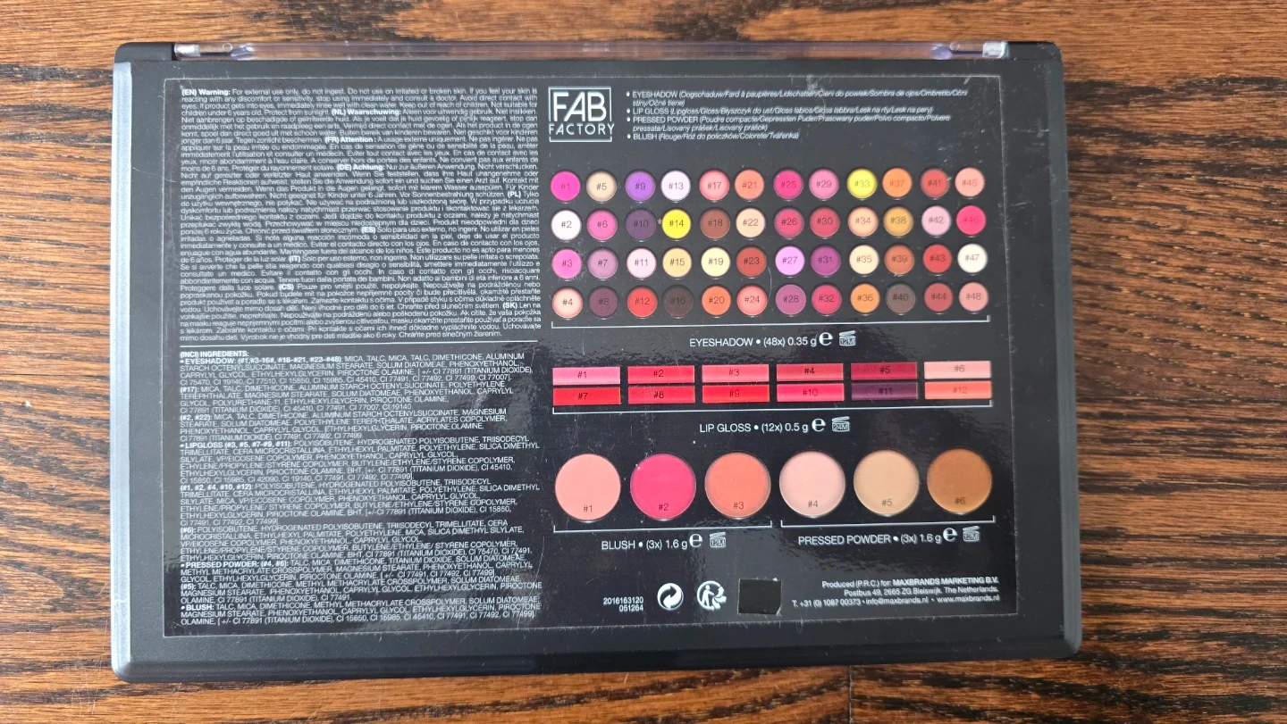 - FAB Factory eyeshadow palette with multiple shades of eyeshadow, blush, and pressed powder.