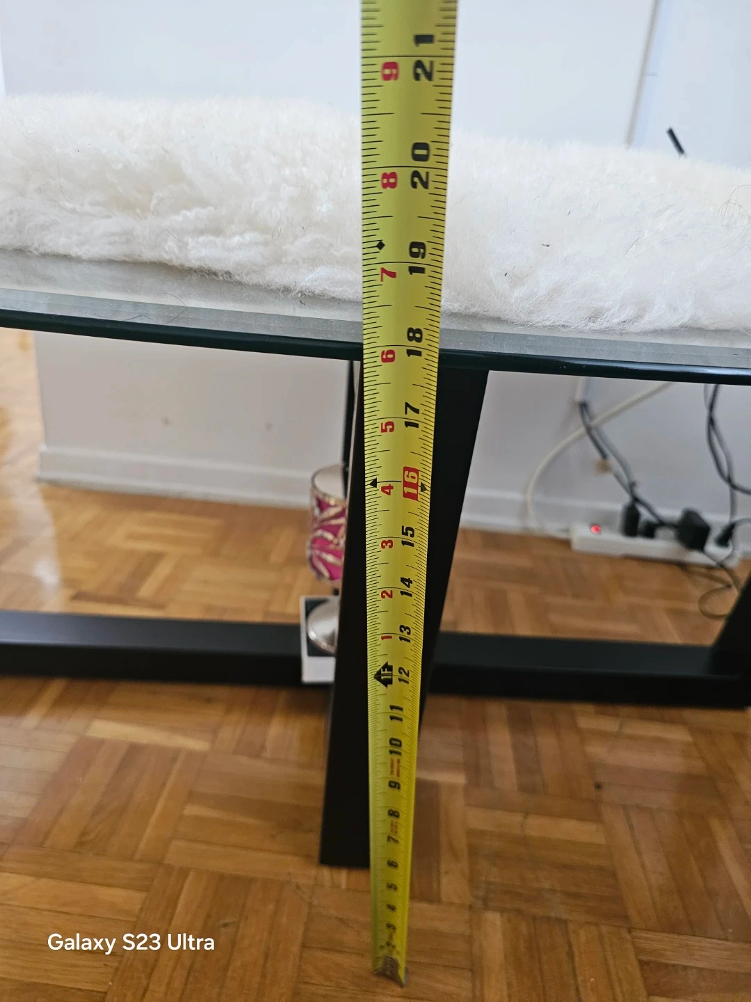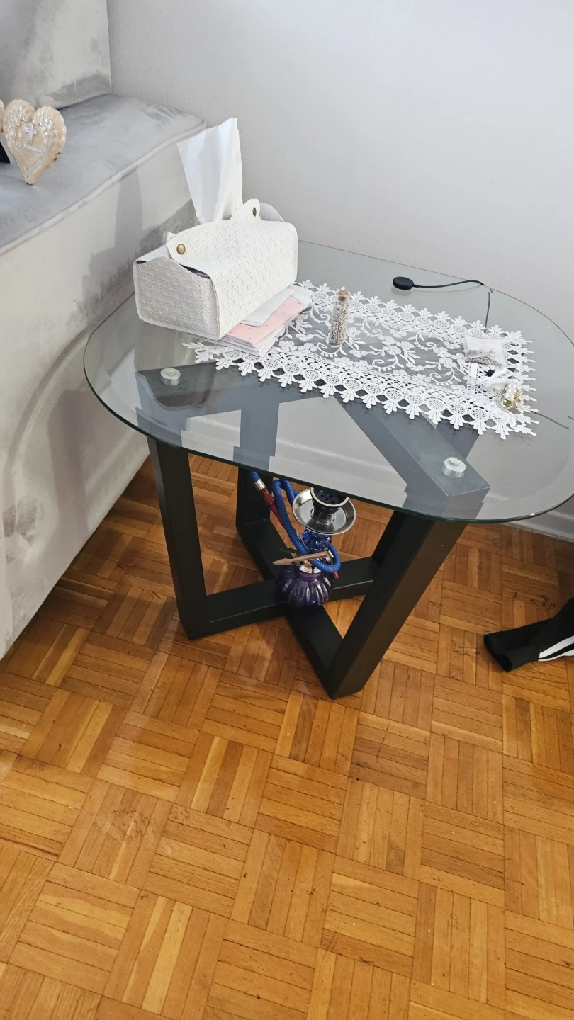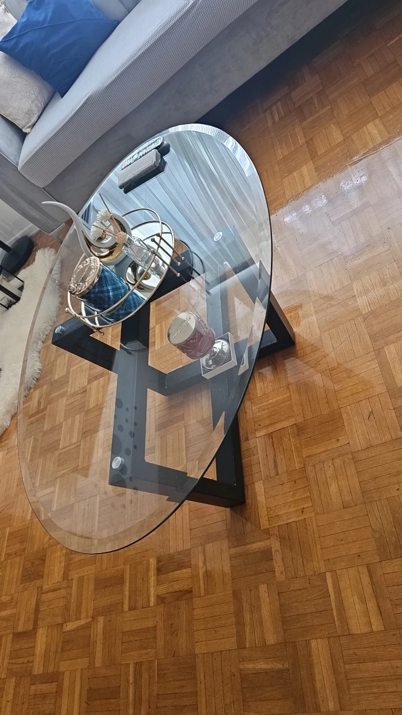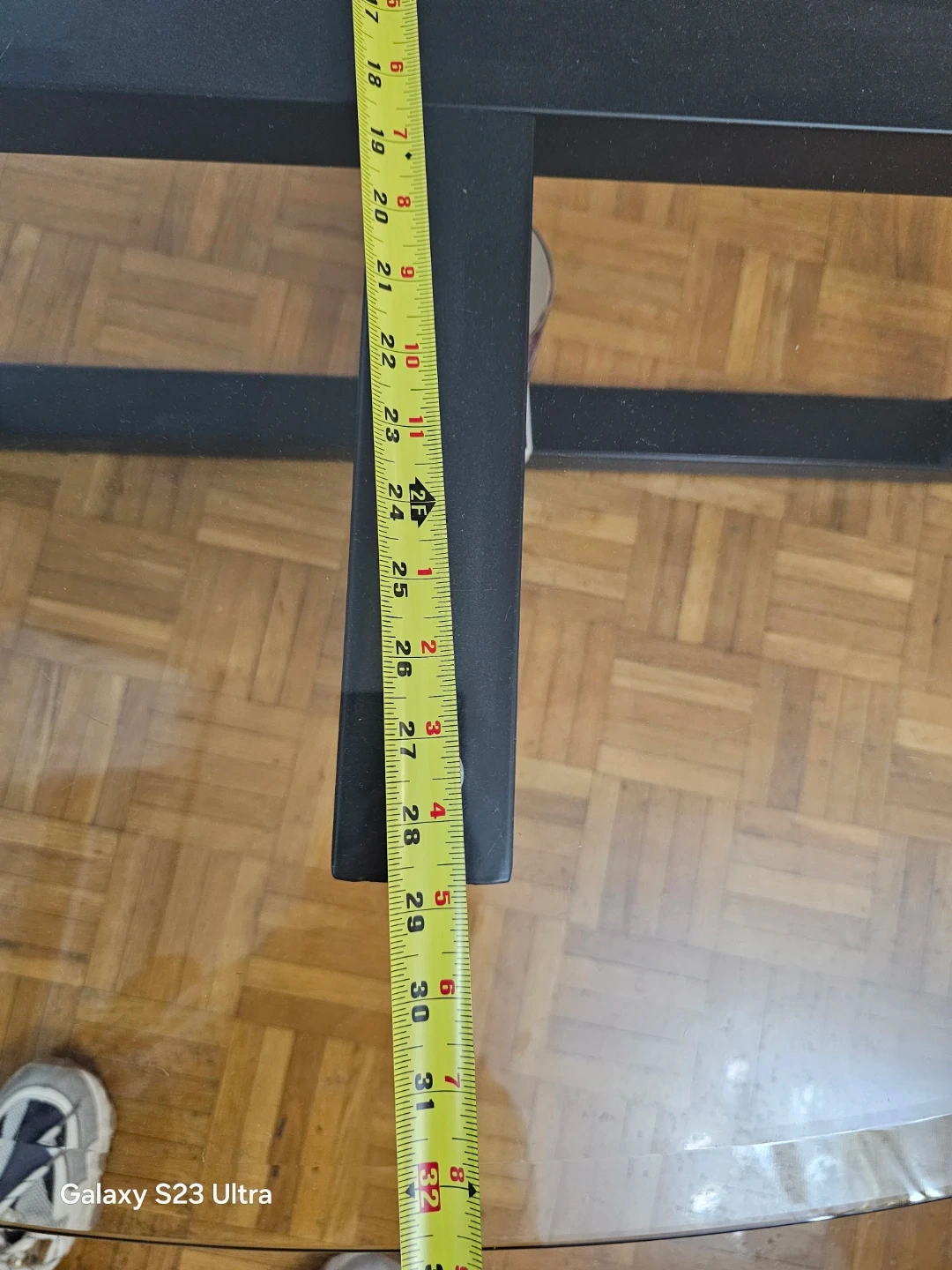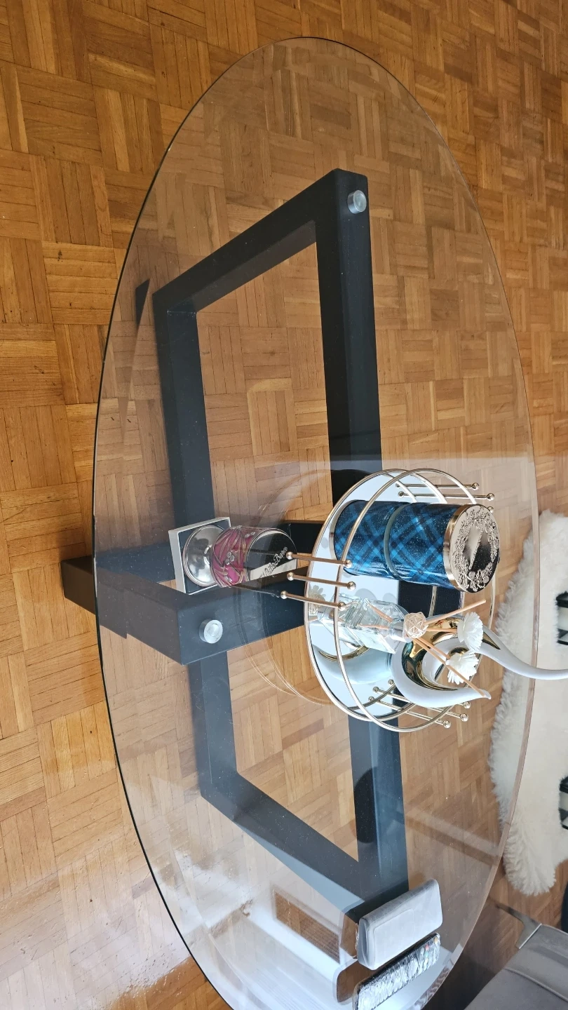Selling a glass top coffee table with a stylish black base. It's in great condition and would look lovely in any living room. The base measures approximately 32 inches in height.
