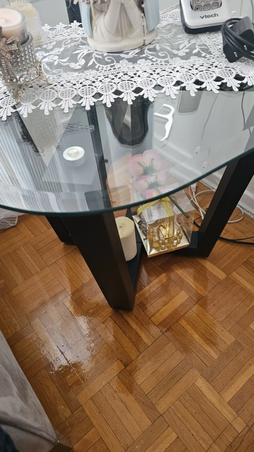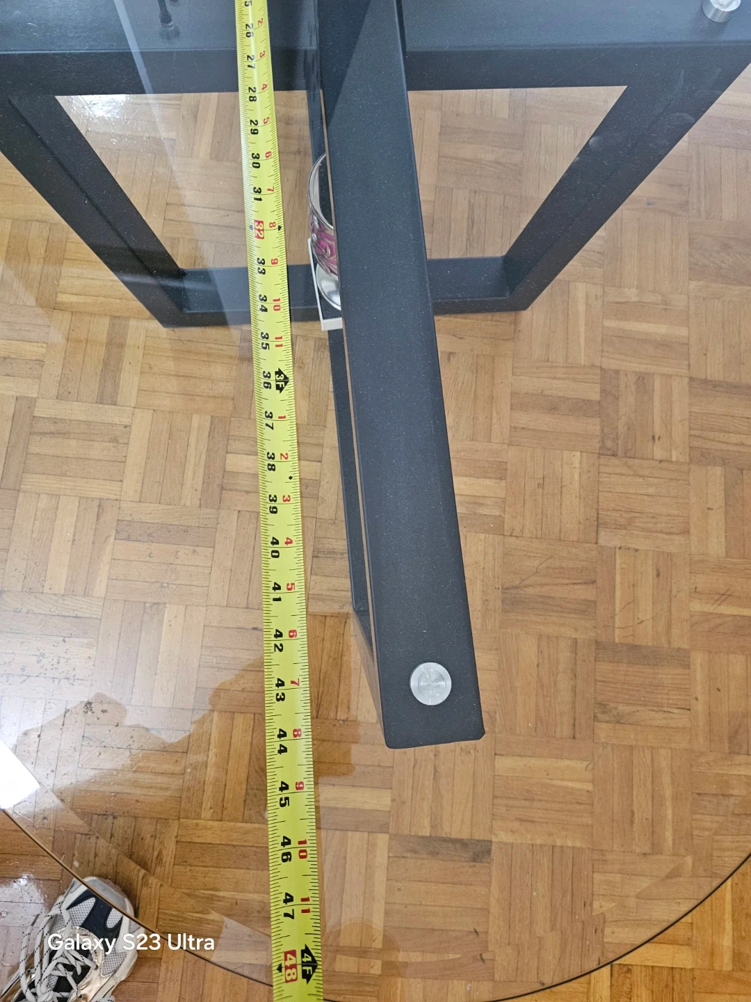 Selling a glass top coffee table with a stylish black base. It's in great condition and would look lovely in any living room. The base measures approximately 32 inches in height.