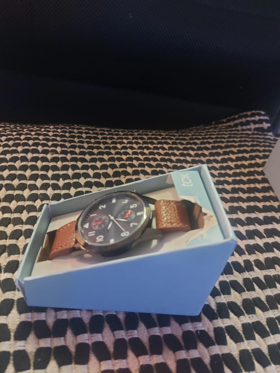 Selling a stylish tck Quartz watch! It features a sleek black dial and a comfortable brown leather strap. The watch comes in its original box, ready for you to enjoy