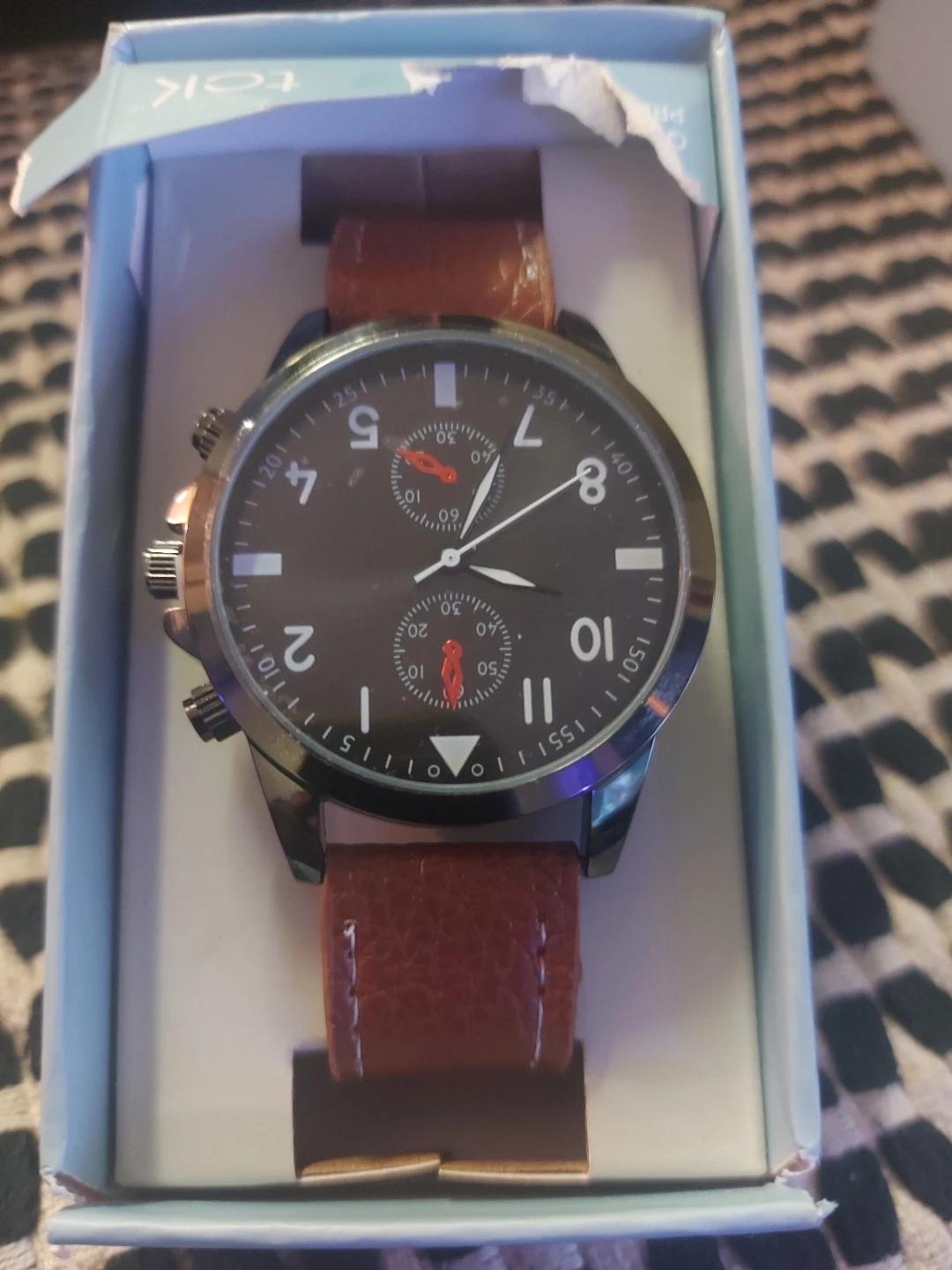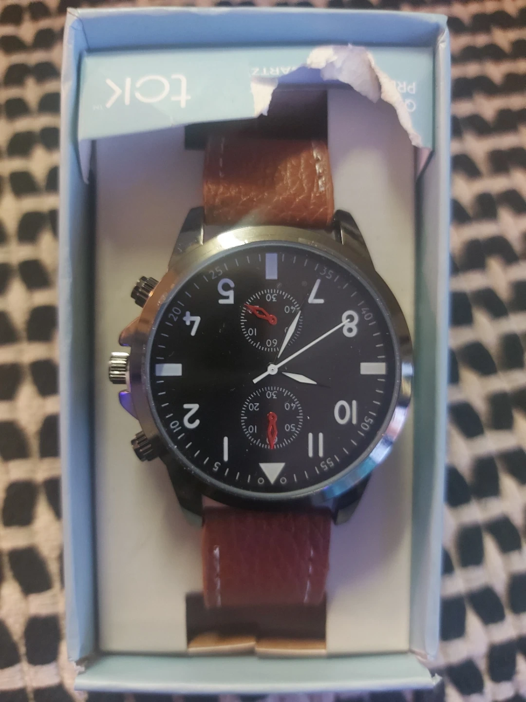 Selling a stylish tck Quartz watch! It features a sleek black dial and a comfortable brown leather strap. The watch comes in its original box, ready for you to enjoy