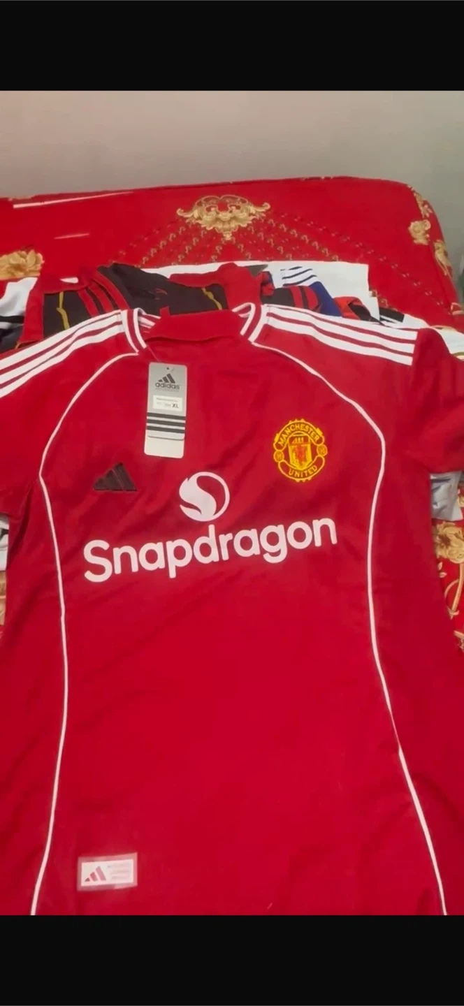 Manchester United FC soccer jersey in red. Features the Adidas logo and Snapdragon sponsor. Size L