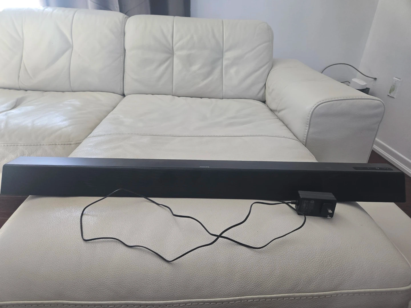 A black Philips soundbar, comes with its power adapter. It's great for enhancing your TV's audio experience. The soundbar is black and includes the necessary power cord.