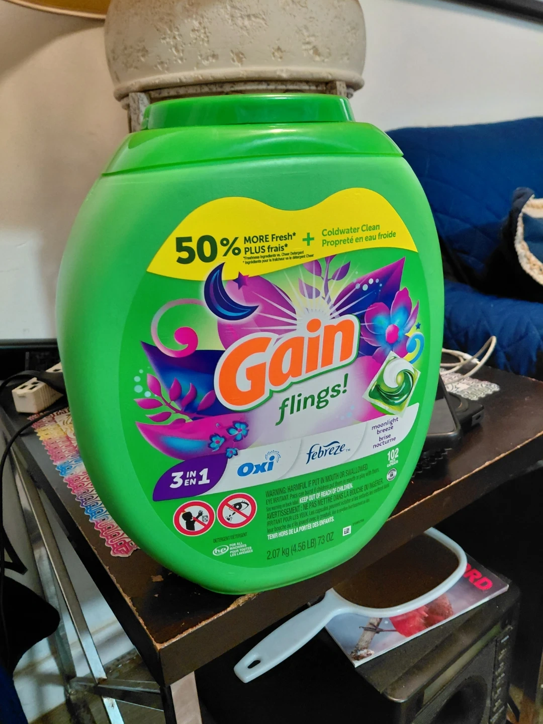 Gain Fling laundry detergent pods in Moonlight Breeze scent. These 3-in-1 Oxi pods offer Coldwater Clean. Each container holds 102 pods, with a net weight of 2.07 kg (4.56 LB).