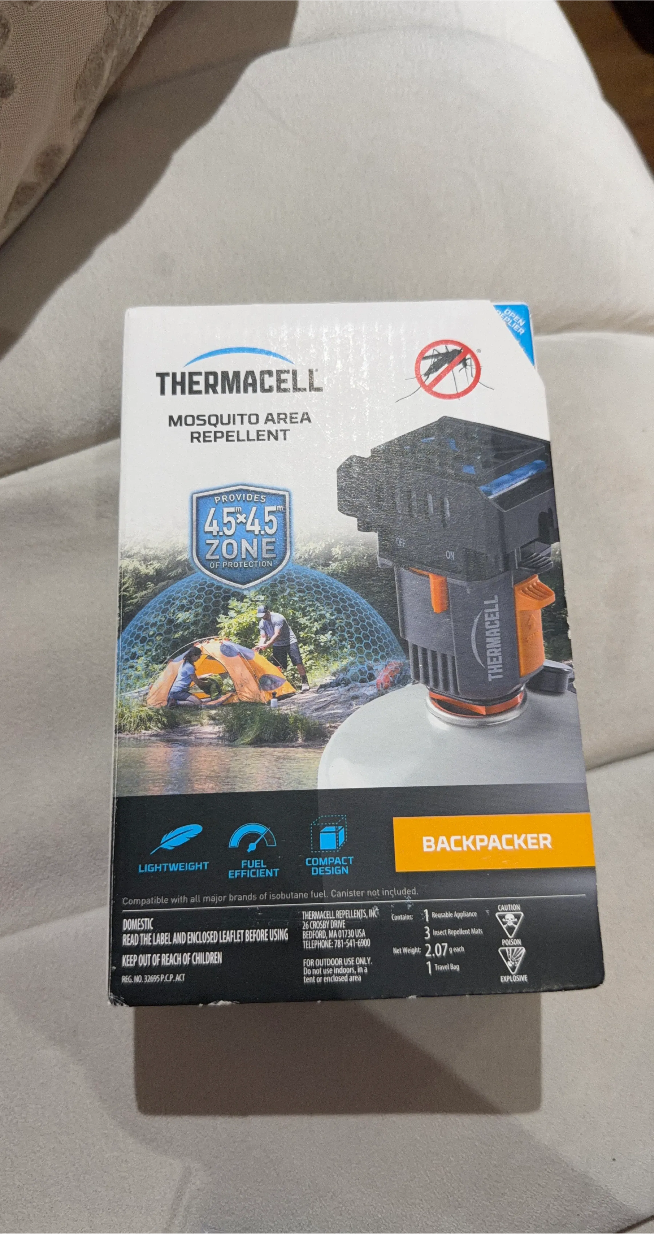 Thermacell mosquito area repellent for outdoor use. Provides a 4.5 x 4.5 m zone of protection. Lightweight and fuel efficient with a compact design. Includes 1 reusable appliance, 3 insect repellent mats, and 1 travel bag.