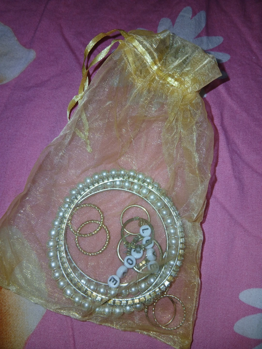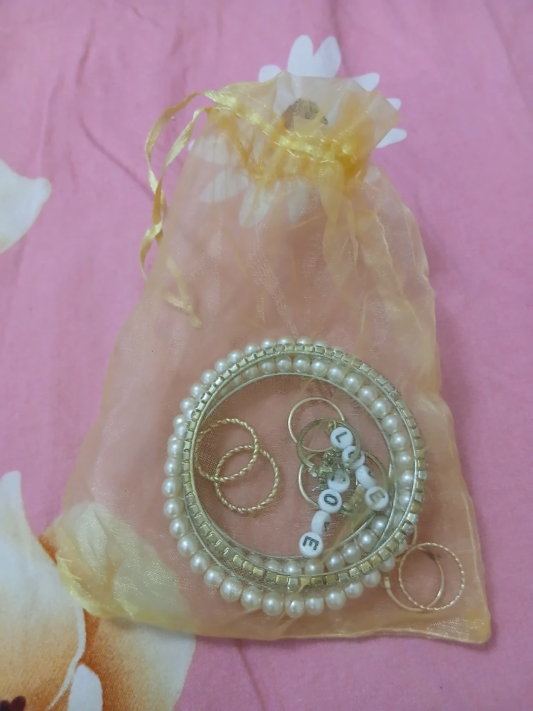A cute set of assorted jewellery including a pearl bangle, gold tone rings, and a 'love' charm, all in a gold drawstring bag, brand new from a surprise bag i got.