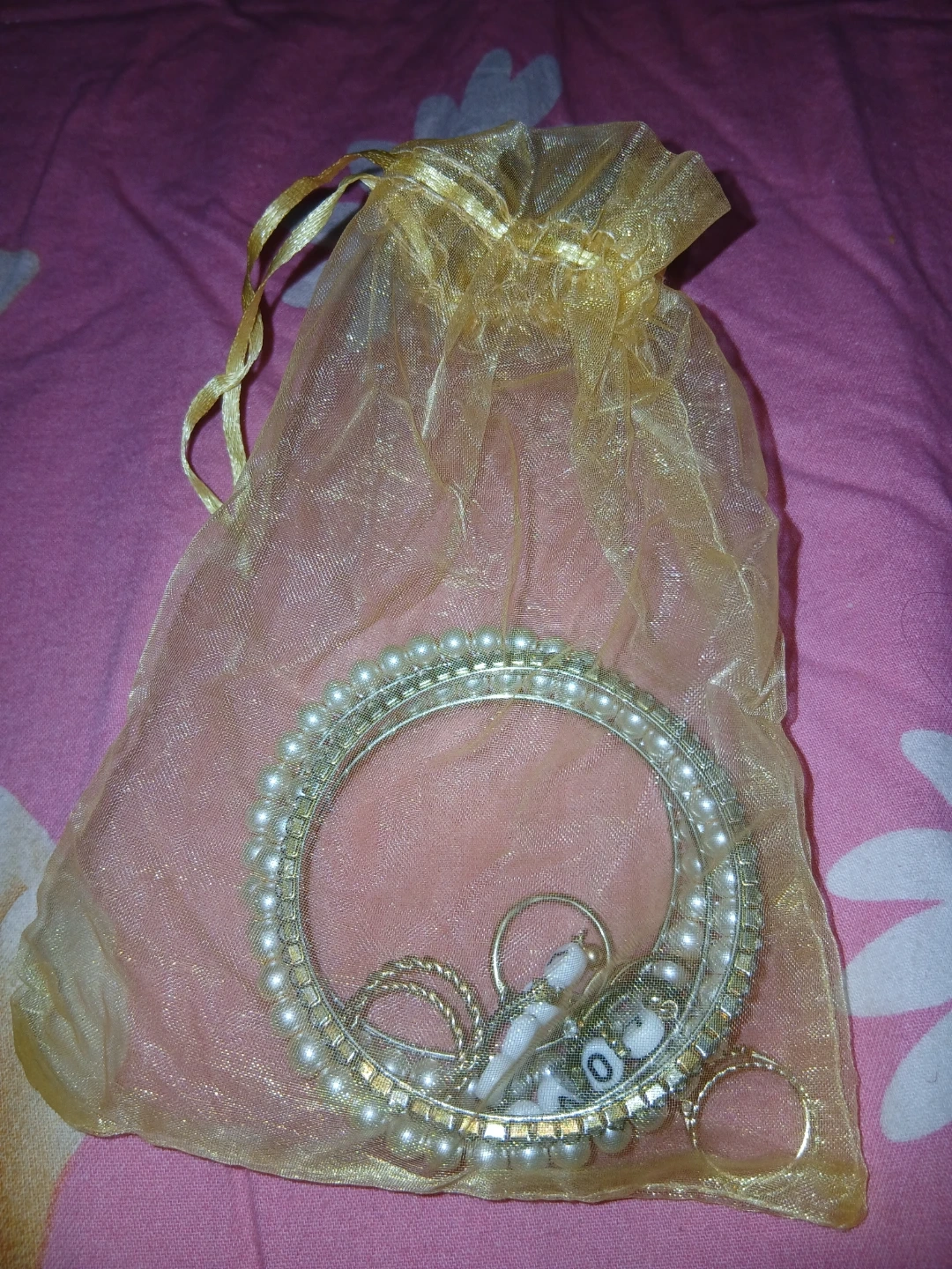 A cute set of assorted jewellery including a pearl bangle, gold tone rings, and a 'love' charm, all in a gold drawstring bag, brand new from a surprise bag i got.