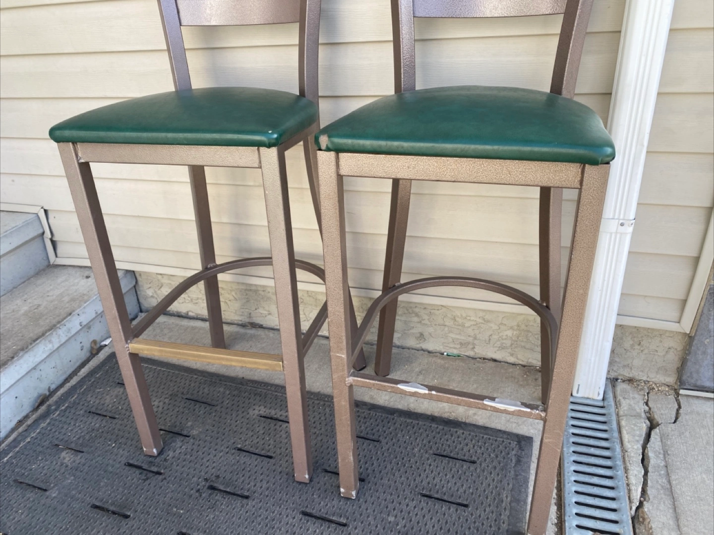 Two bar stools, metal frame, green vinyl seats. Good for a kitchen island or bar. Has a bit of chipping