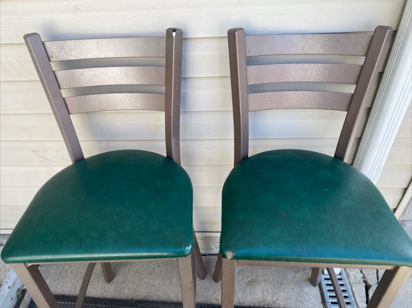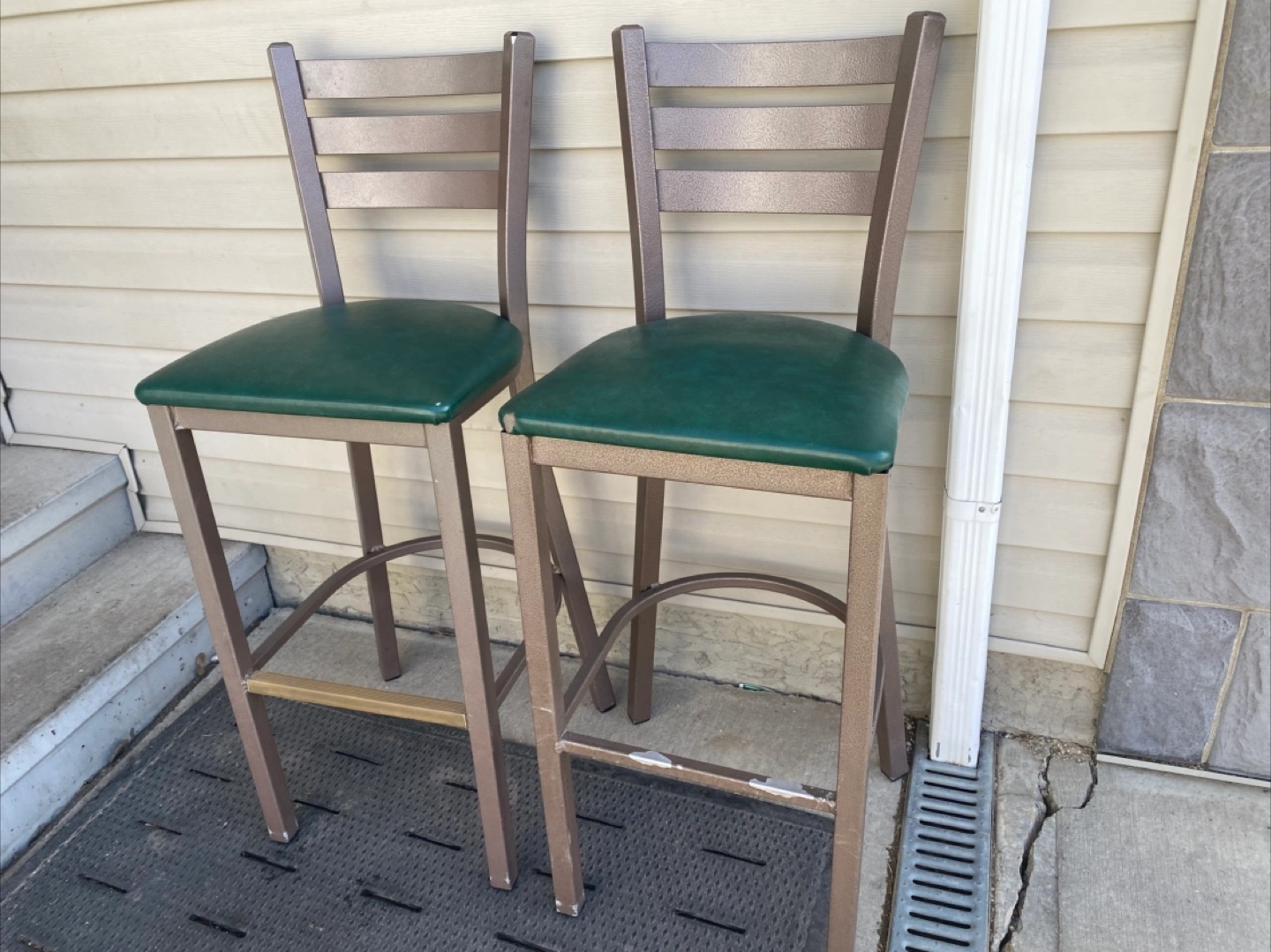 Two bar stools, metal frame, green vinyl seats. Good for a kitchen island or bar. Has a bit of chipping