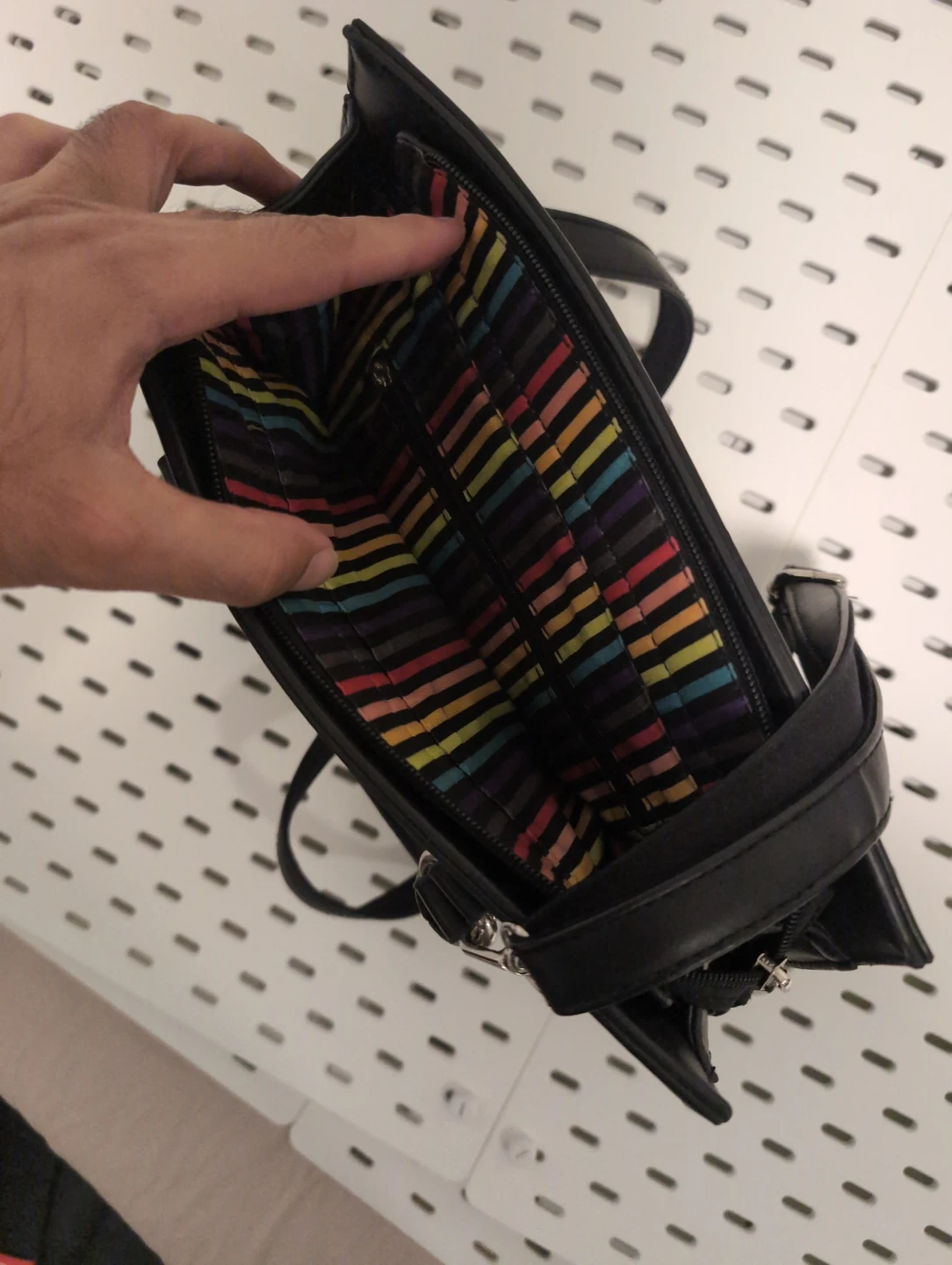 This colour-blocked handbag features a stylish mix of black, grey, and white panels. It has a zippered closure and a detachable shoulder strap. The interior lining is brightly striped.
