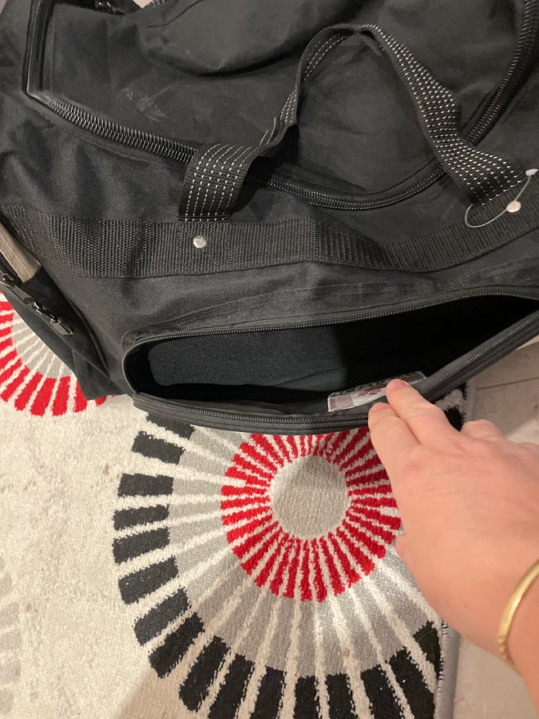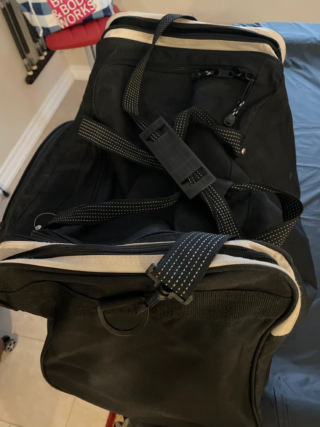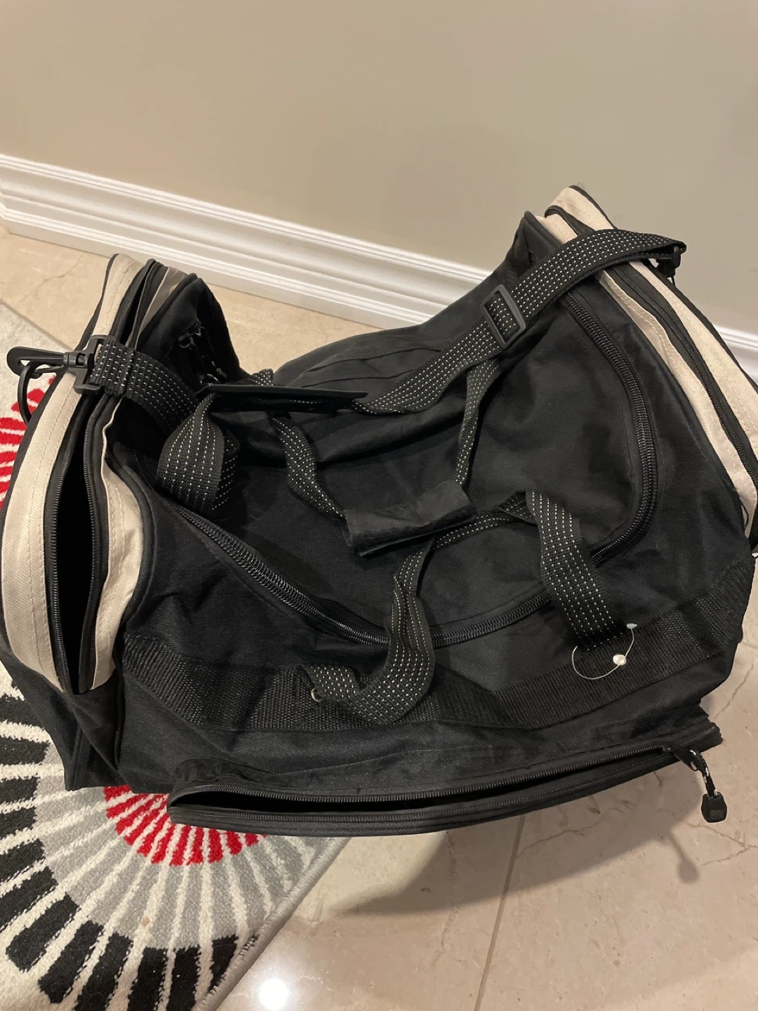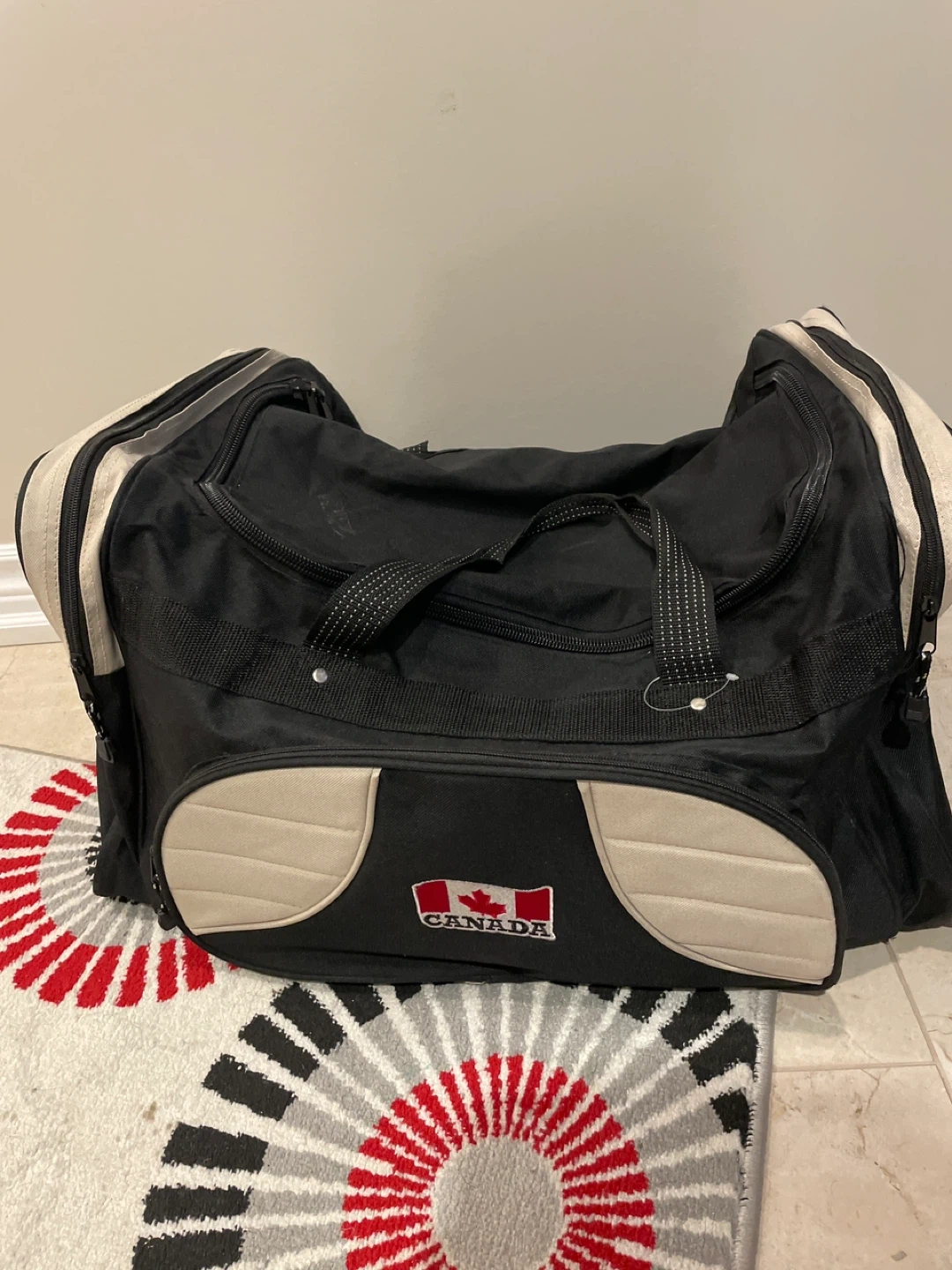 This is a black duffel bag featuring a Canada logo on the front. It has multiple zippered compartments for organization. Durable fabric construction.