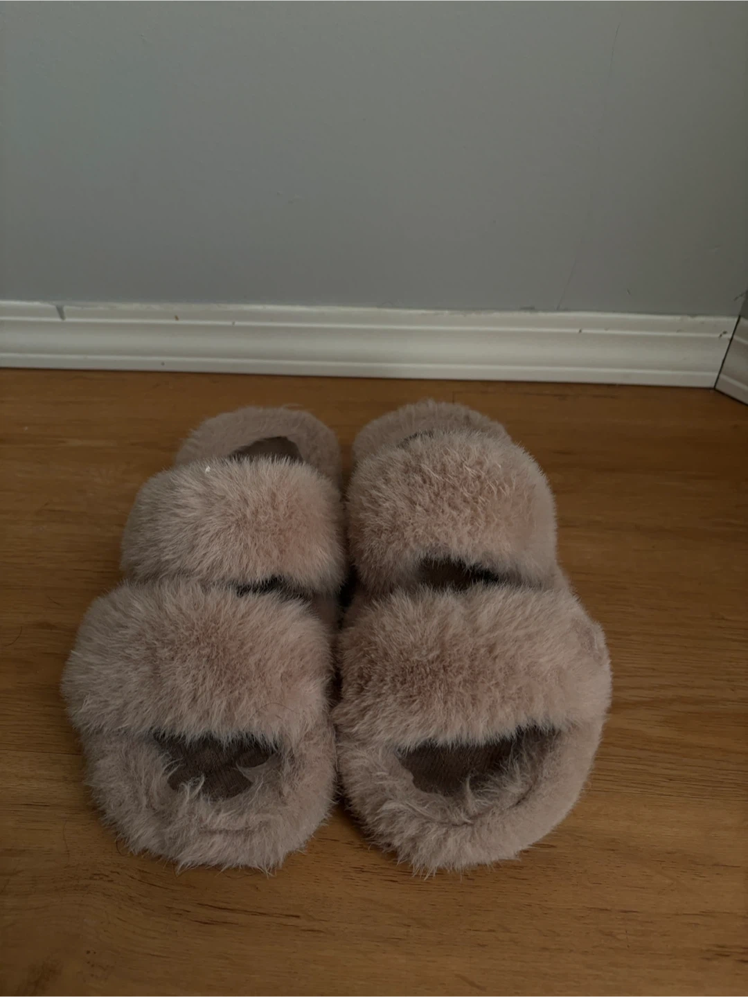 Comfy faux fur slide slippers in a neutral beige colour. These slides feature a plush, soft texture and an open-toe design. Perfect for lounging around the house!