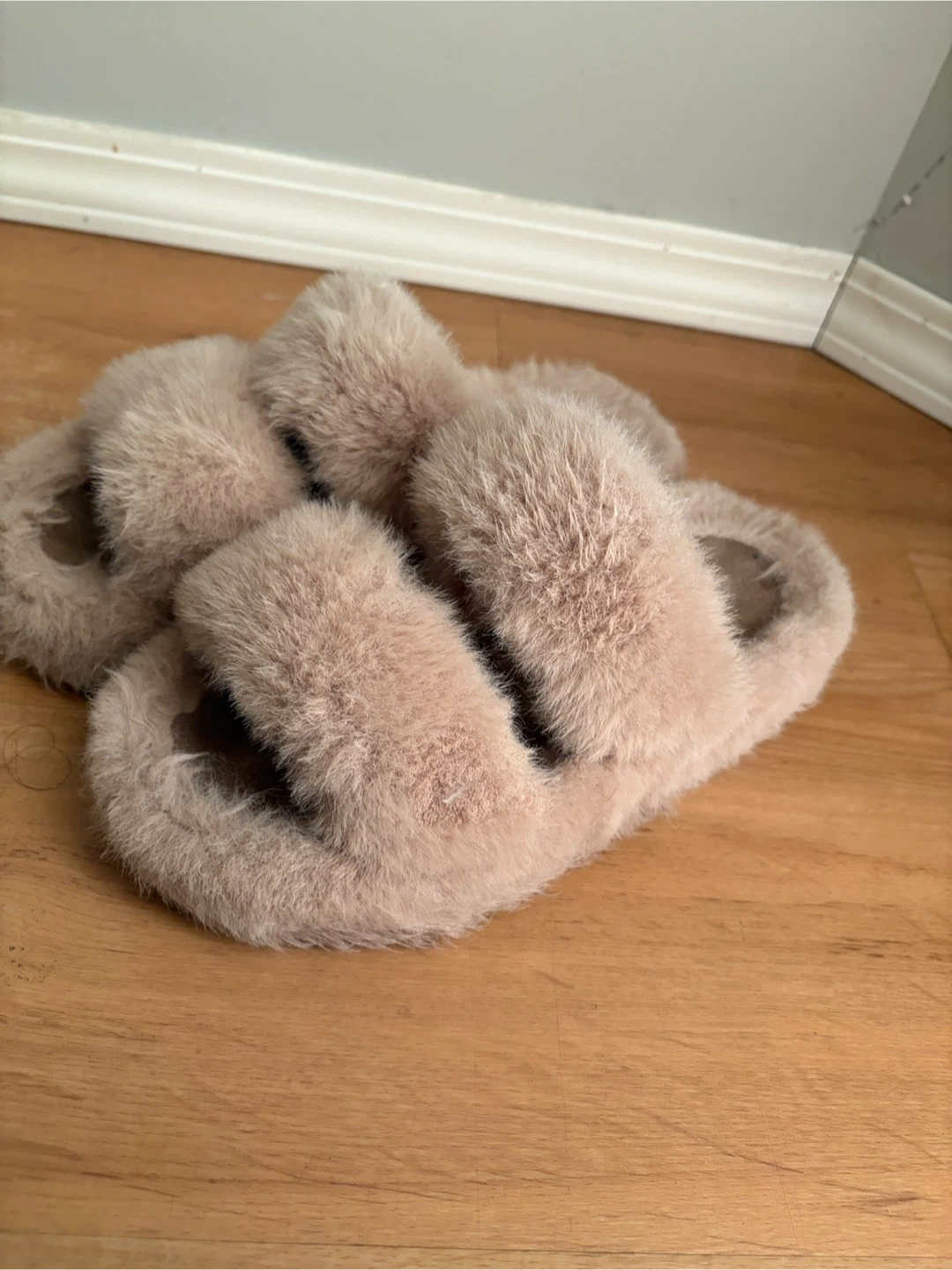 Comfy faux fur slide slippers in a neutral beige colour. These slides feature a plush, soft texture and an open-toe design. Perfect for lounging around the house!