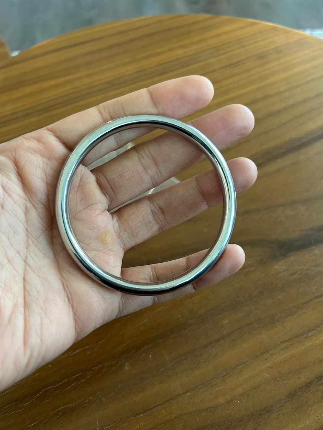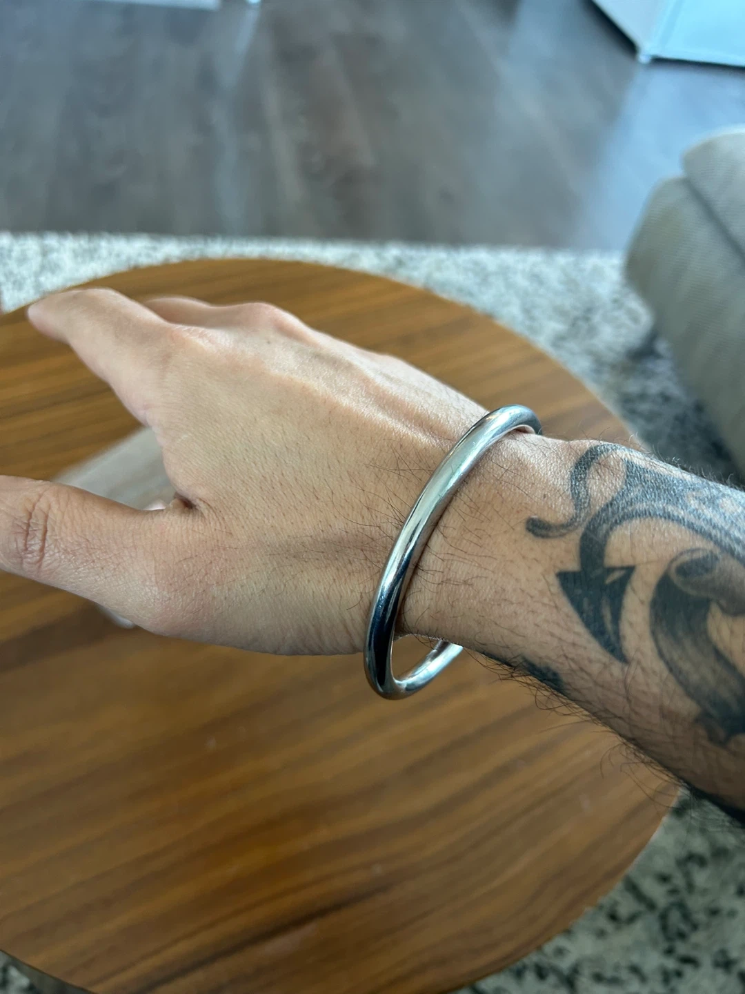 Selling a stainless steel bangle bracelet. It's 67mm in diameter. It's not hollow and is made of solid industrial grade steel and is in great condition!