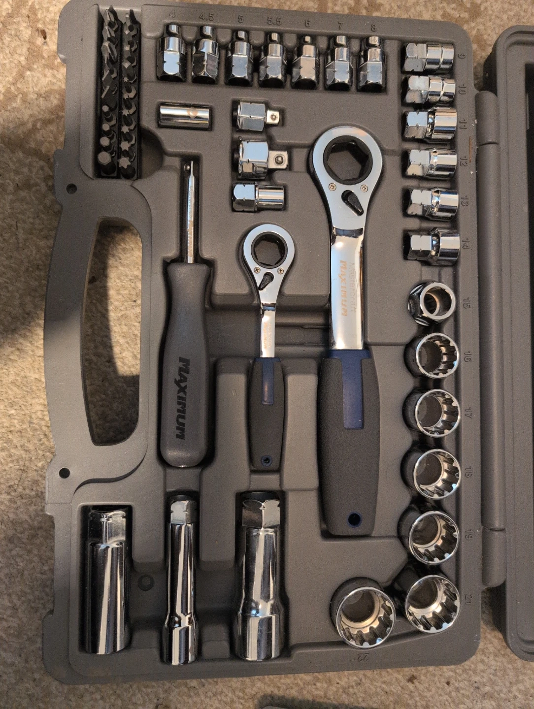 This is a Mastercraft Maximum socket set in a durable grey carrying case. It includes two ratchets, assorted sockets, and screwdriver bits. A great set for various home or automotive repairs!