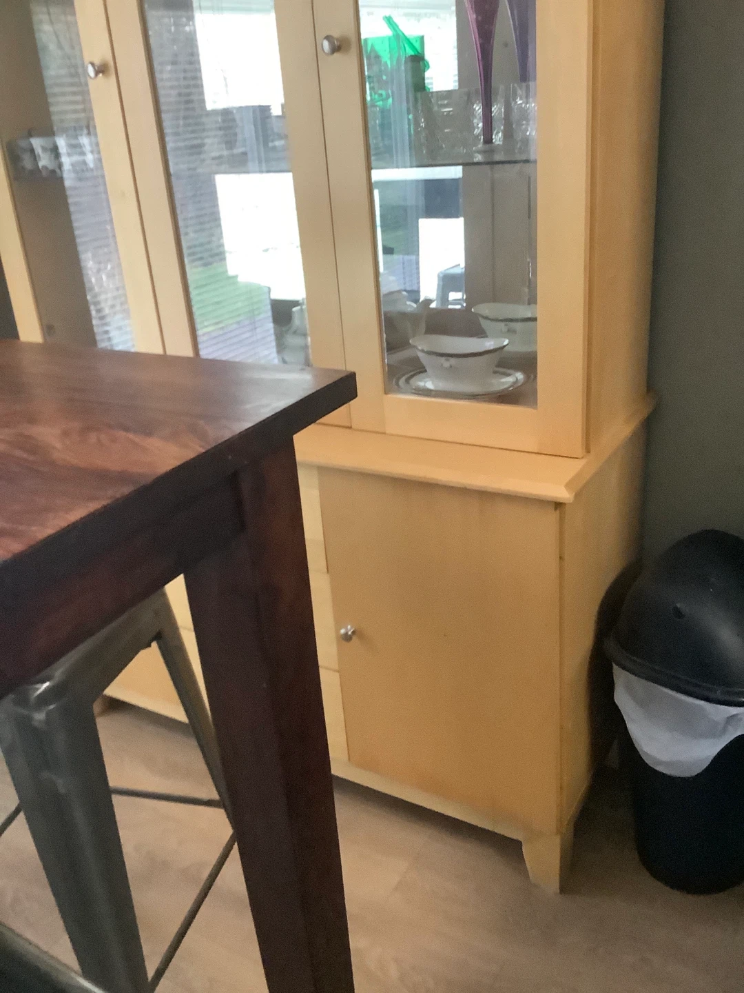 This display cabinet has two glass doors on top and two solid doors on the bottom. It's a light wood finish with silver knobs. Some dishes are visible inside the upper section. Good for storing or displaying items!