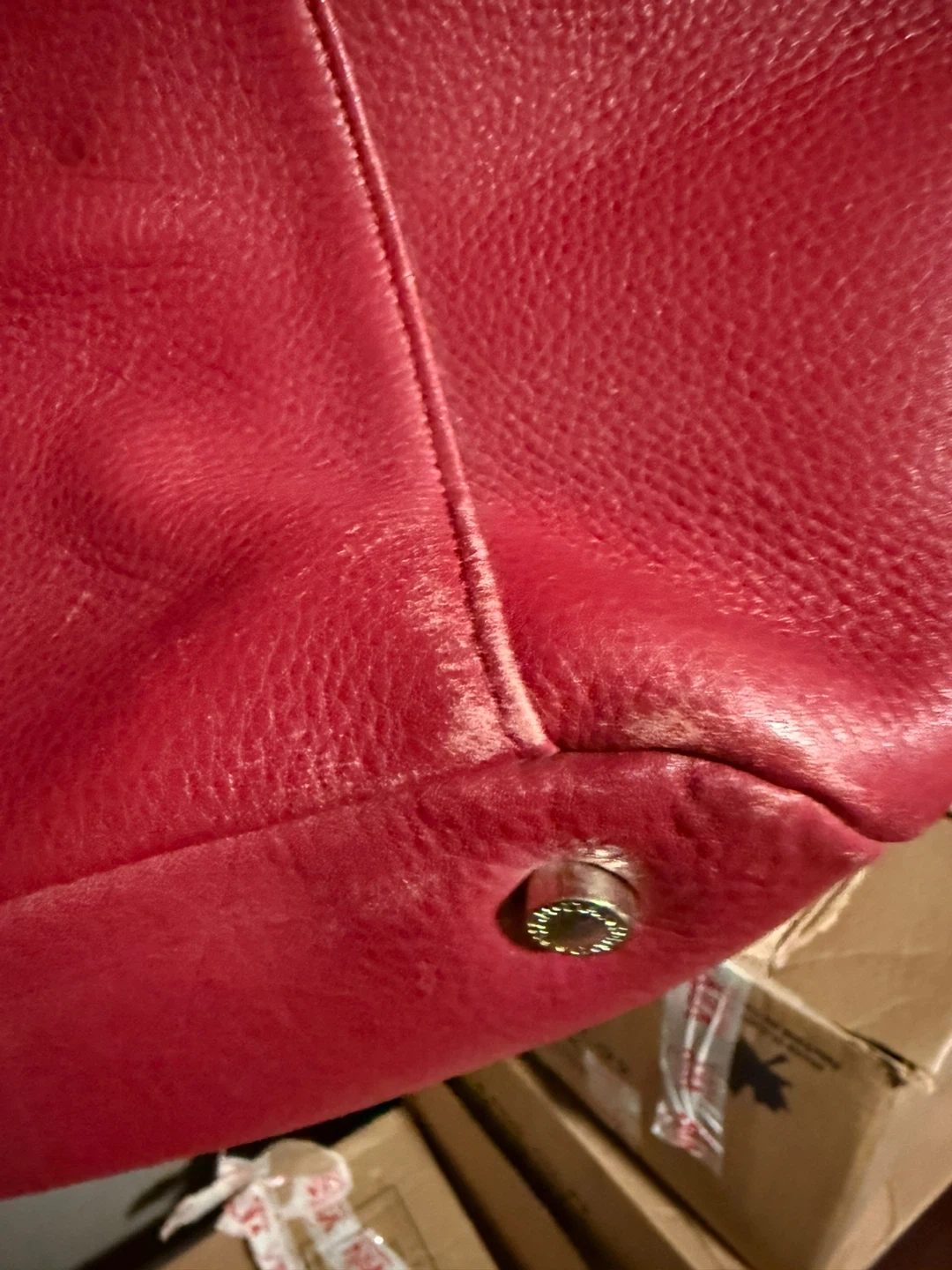 This red leather tote bag features a chain detail and zippered top closure. It's made from genuine leather. This bag is perfect for everyday use, offering both style and practicality.