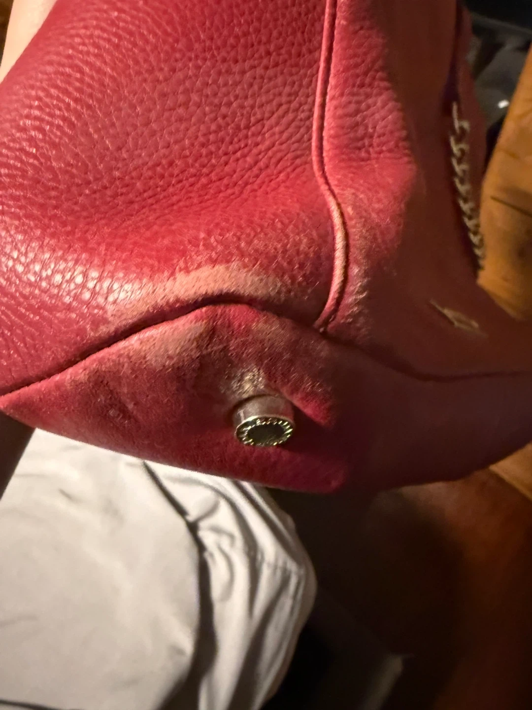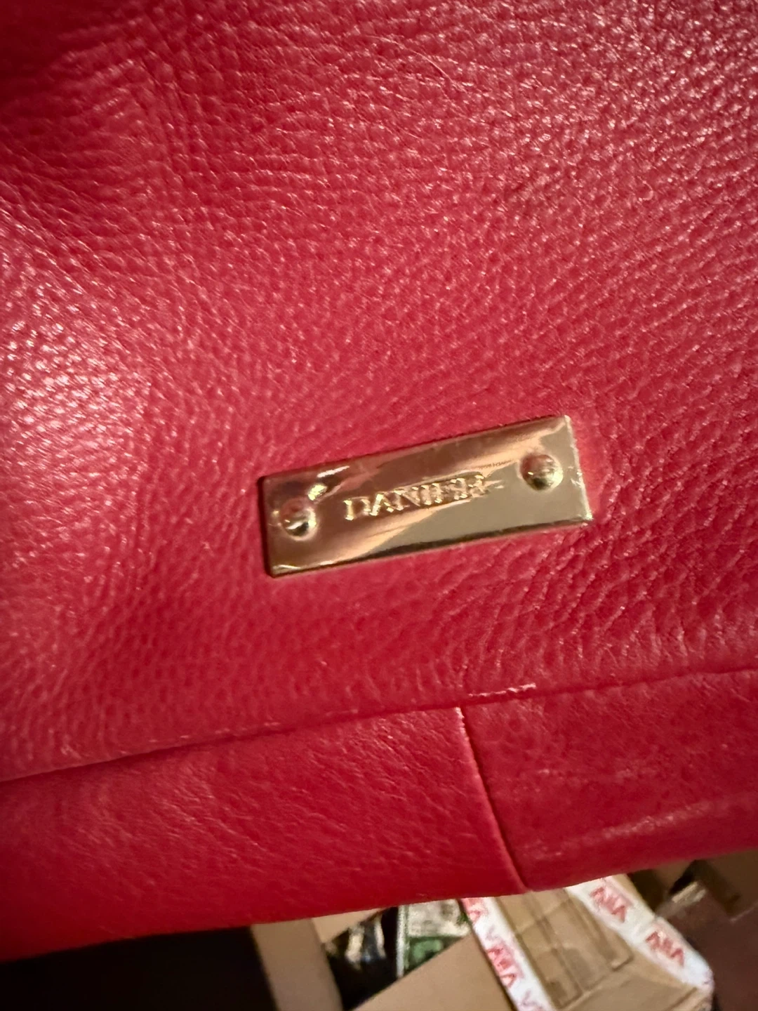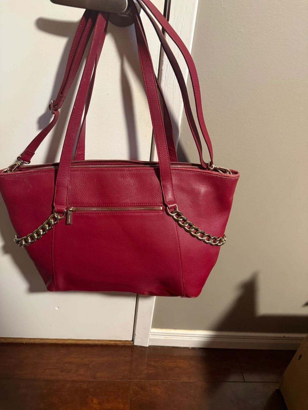 This red leather tote bag features a chain detail and zippered top closure. It's made from genuine leather. This bag is perfect for everyday use, offering both style and practicality.