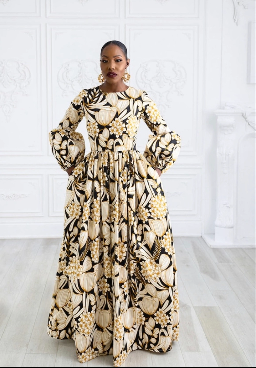 Gorgeous floor-length dress. Features a fitted bodice and a flowing skirt. Long puff sleeves and a round neckline. Black and gold floral print. Pocket detail.