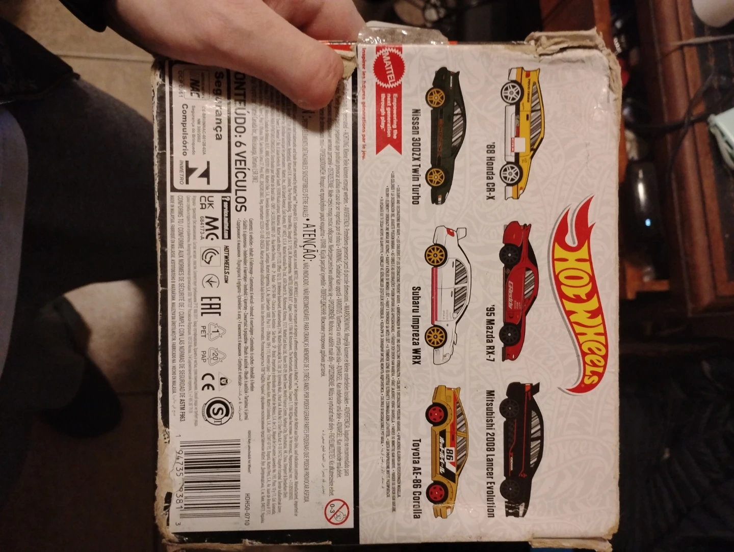 This Hot Wheels set includes six detailed die-cast cars. It features models like the '88 Honda CR-X, '95 Mazda RX-7, Mitsubishi Lancer Evolution, Nissan 300ZX Twin Turbo, Subaru Impreza WRX, and Toyota AE-86 Corolla. Perfect for collectors or playtime!
