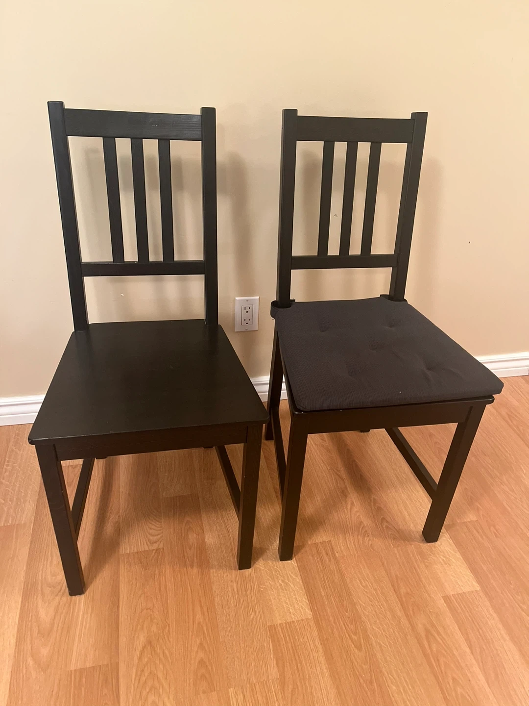 Selling a set of two IKEA INGOLF chairs in black. They're in great shape and ready to add some classic style to your dining area or kitchen. One of the chairs has a cushion included!