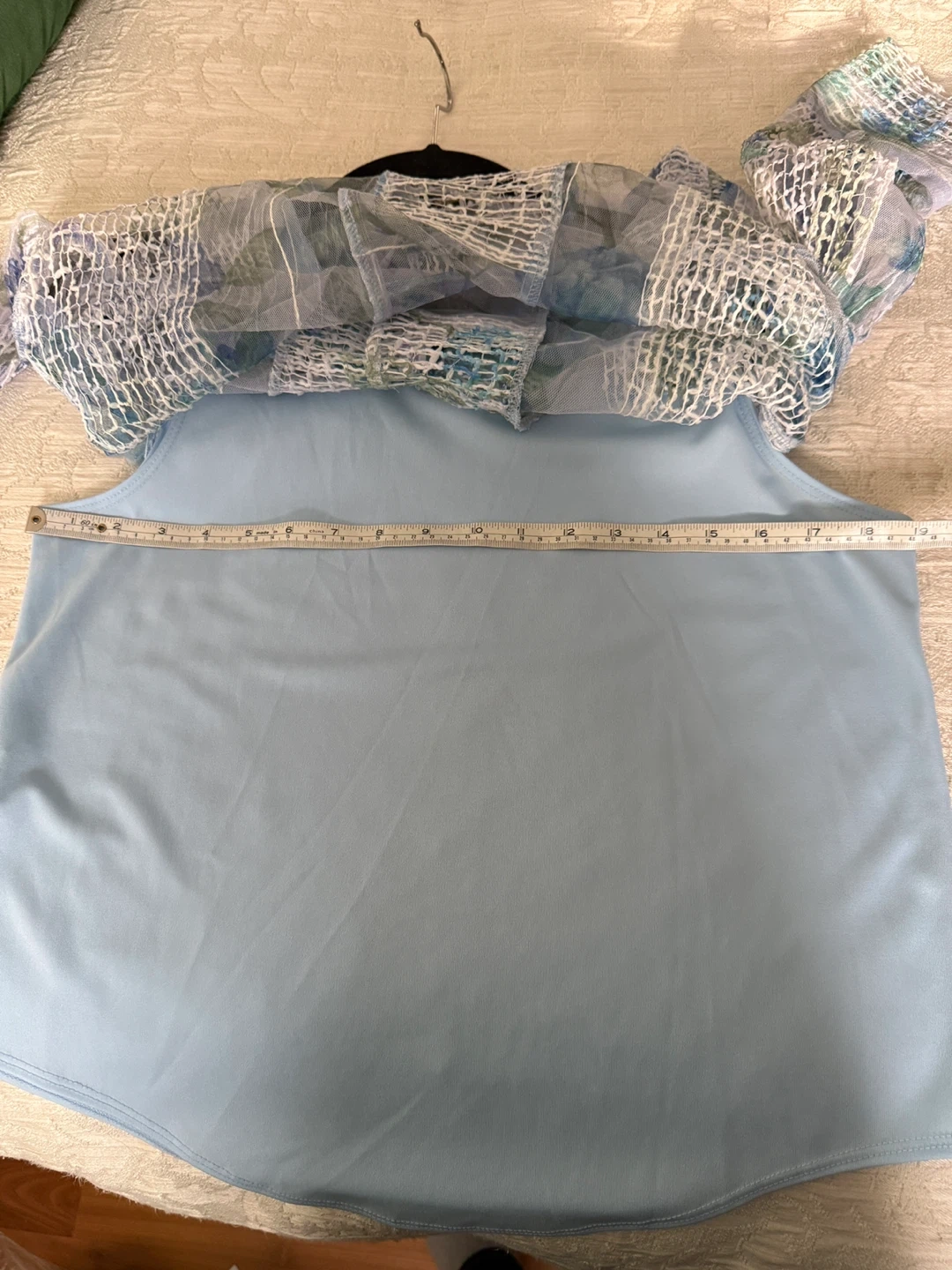 This Picadilly tunic top features a delicate blue floral print on a sheer mesh overlay. It's a comfortable layering piece with a scoop neckline. Fabric is polyester blend.