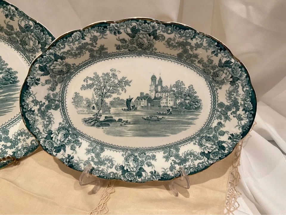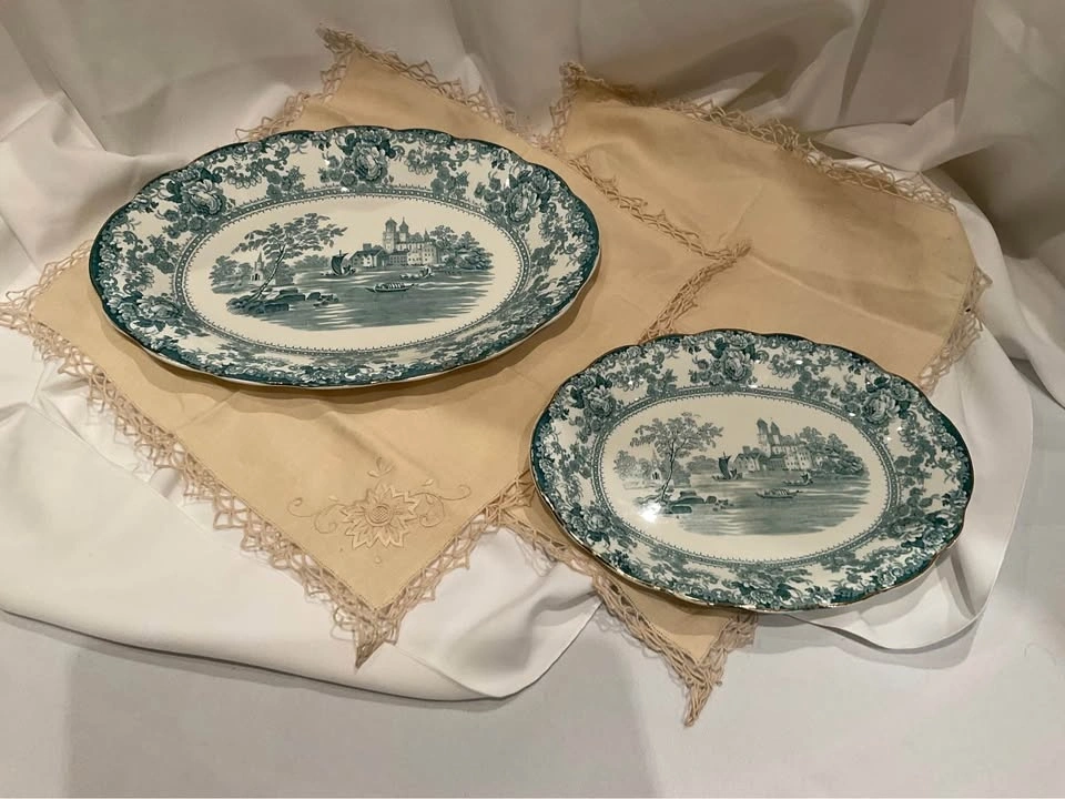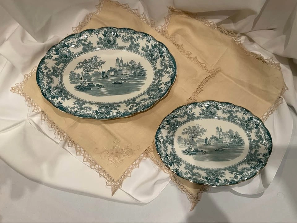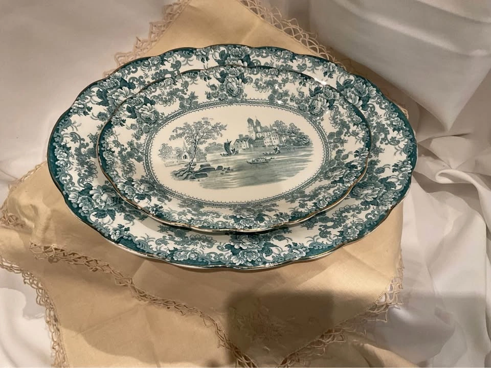 Stunning pair of vintage transferware serving platters in the lovely teal "Togo" pattern. Collectible Staffordshire Pottery pieces. One large platter measures 16 x 11 1/2 inches, and the smaller one measures 12 x 9 inches. From a smoke and pet-free home. Available for cash purchase in Richmond Hill, near Bathurst & King Rd.