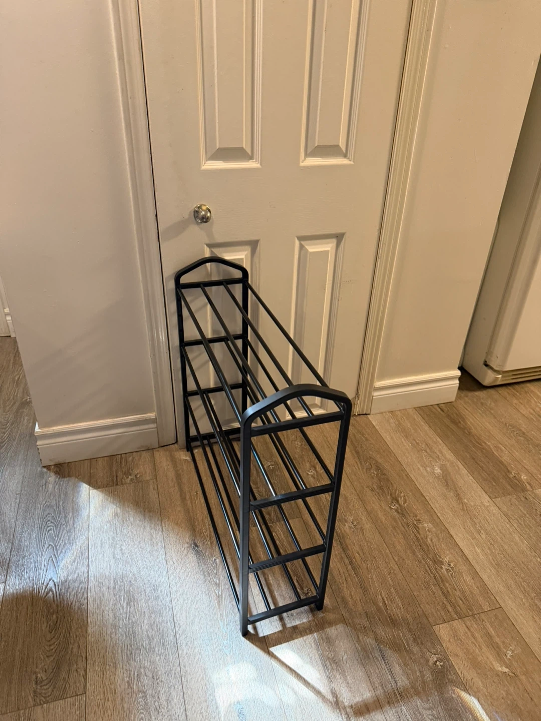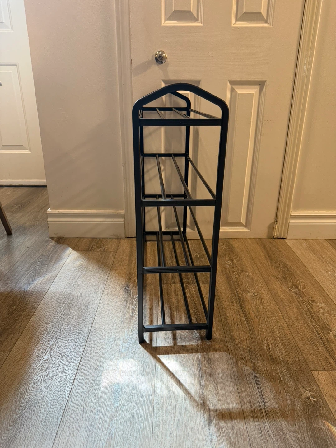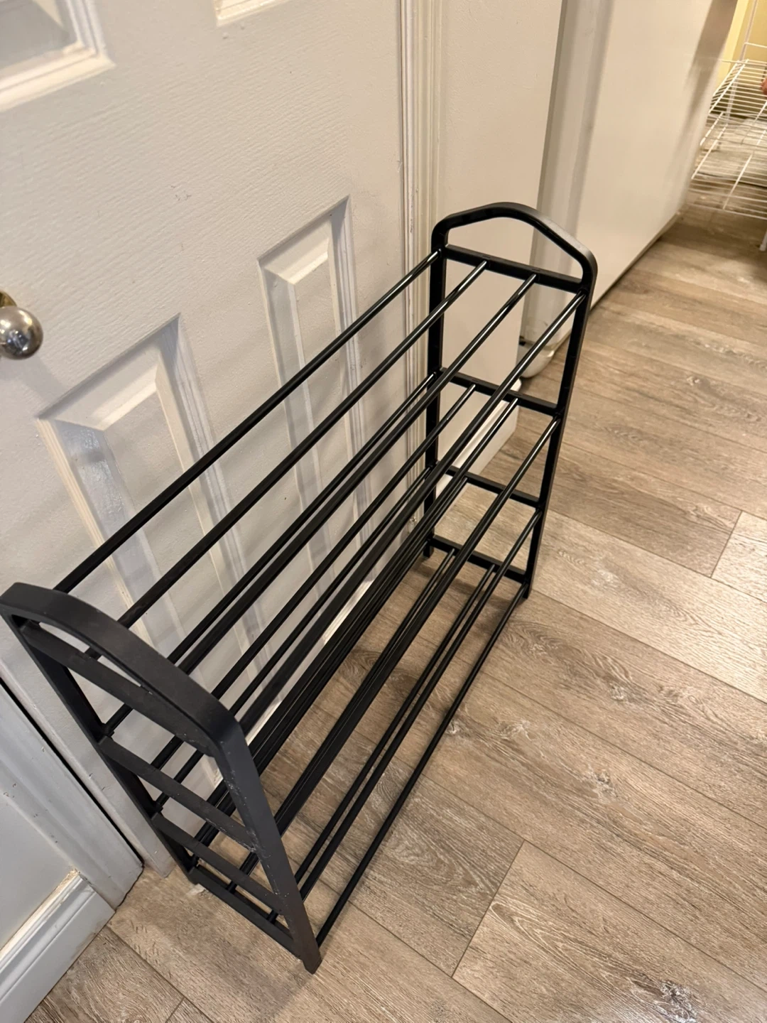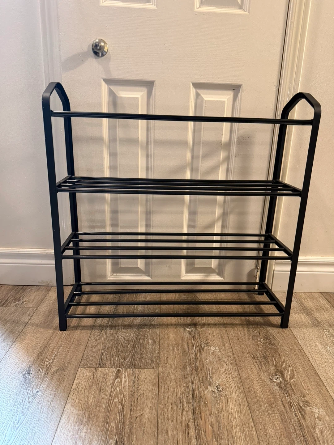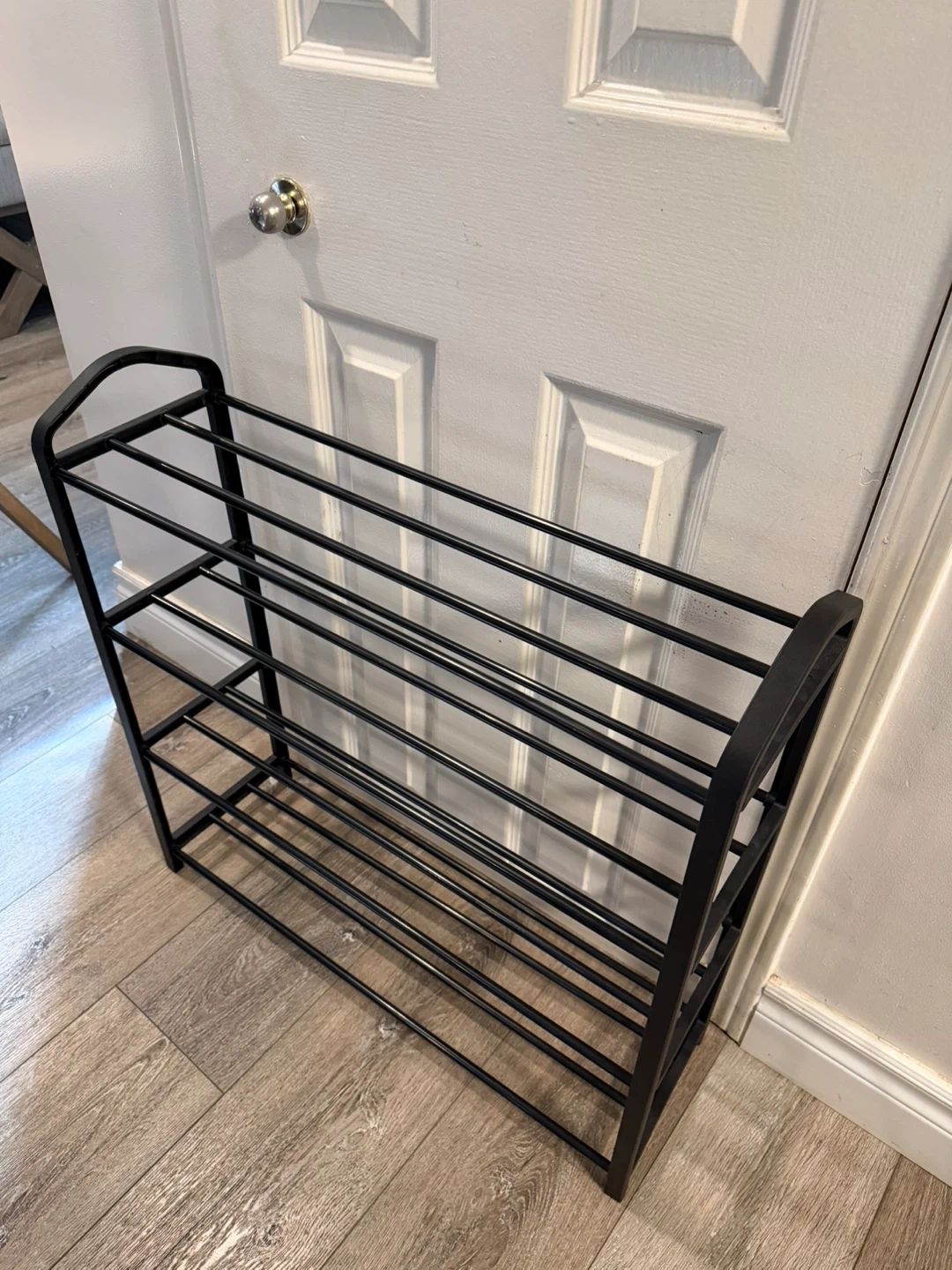 This black metal shoe rack has four tiers for ample storage. It's made of sturdy metal construction. Keep your footwear tidy and off the floor!