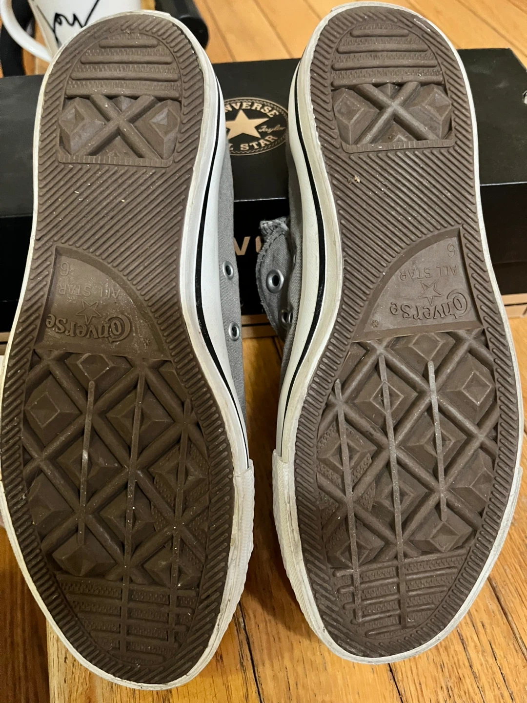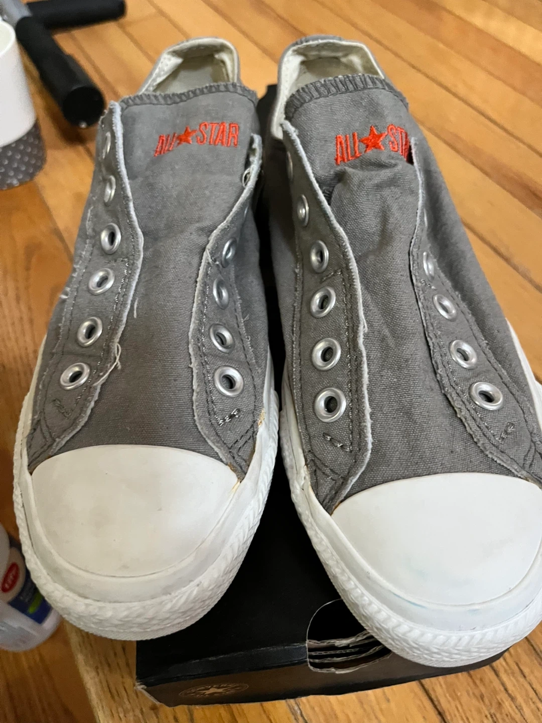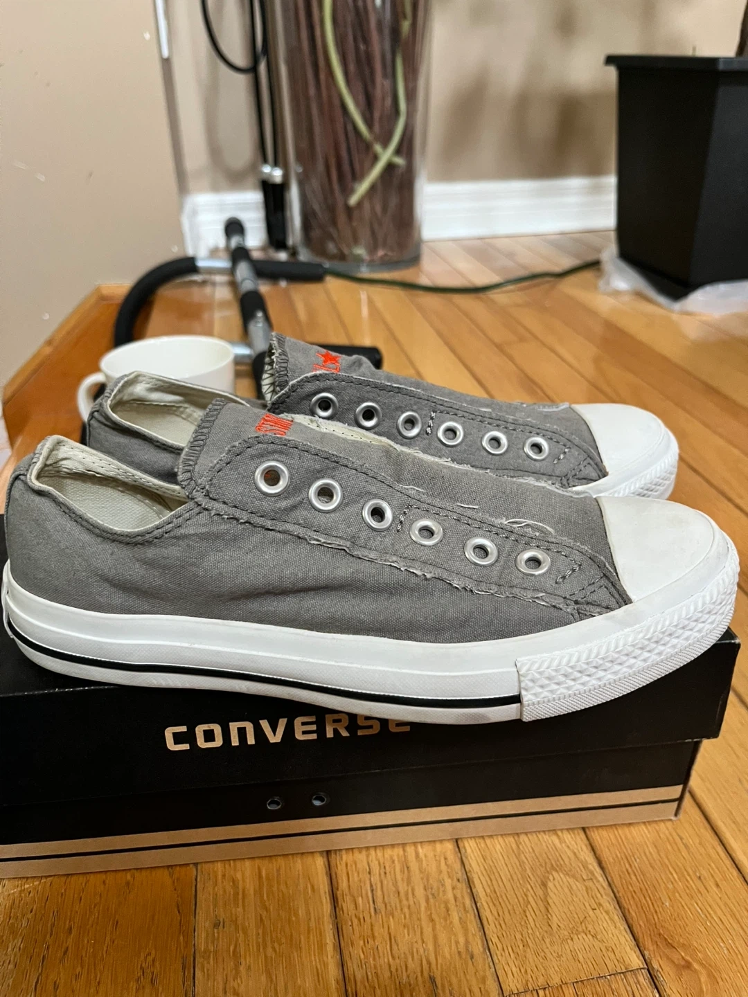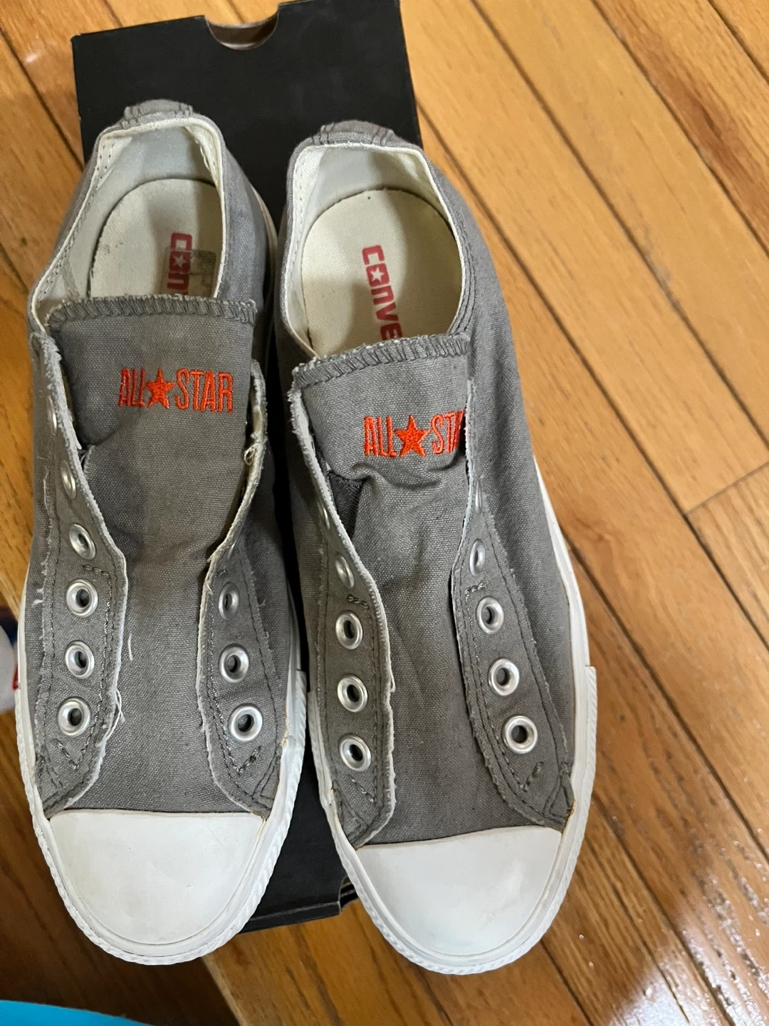 Grey canvas slip-on sneakers with red "All Star" embroidery. White rubber toe cap and sole. Includes original box.