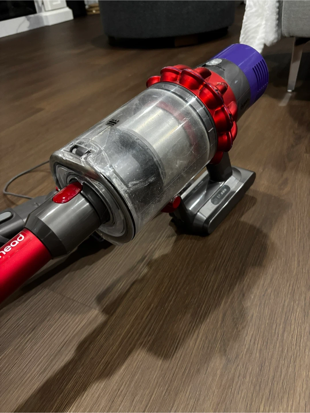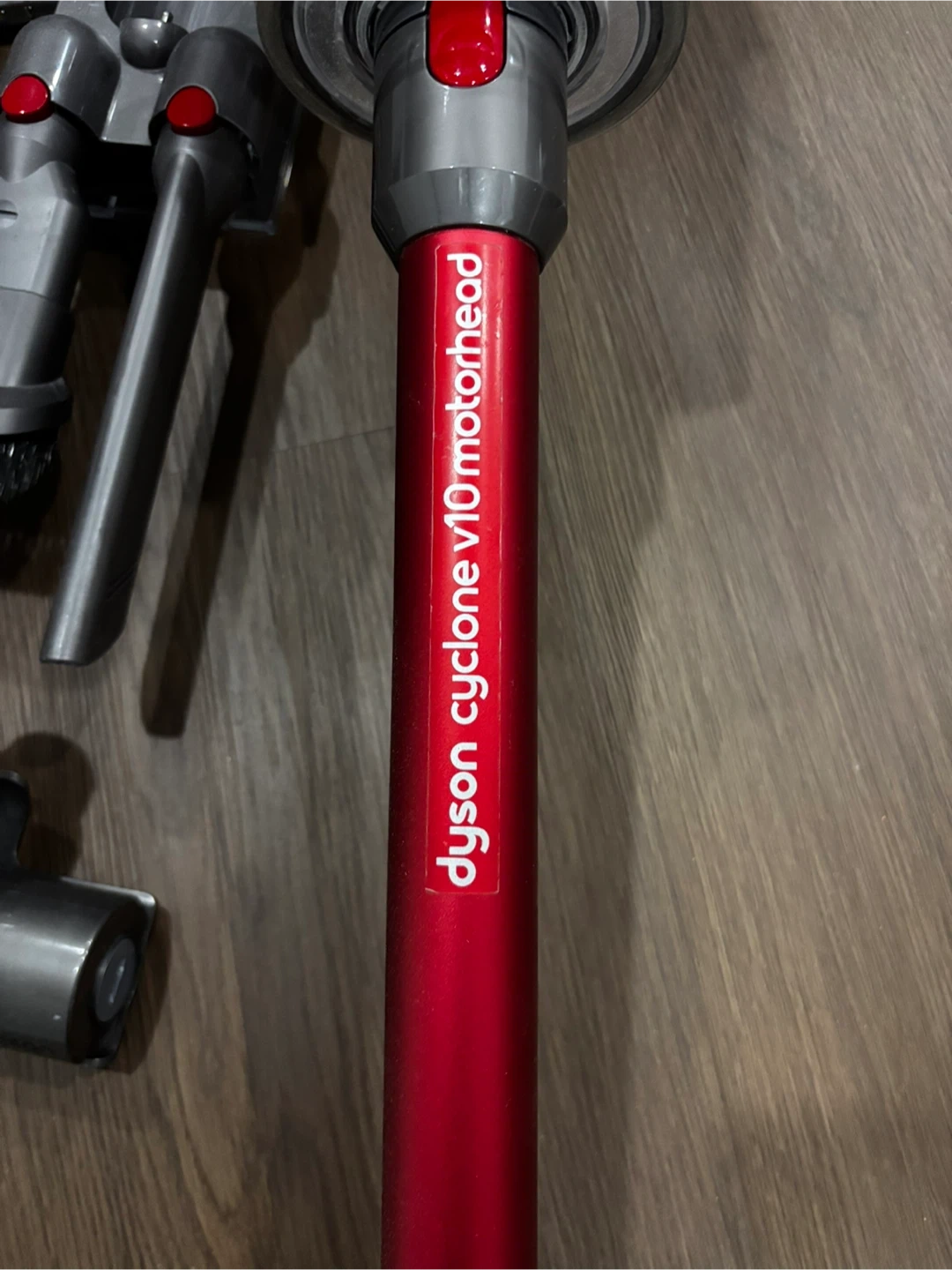 This is a red Dyson Cyclone V10 Motorhead vacuum cleaner. It comes with a charger and multiple attachments. Powerful suction for effective cleaning! Works great with no issues.