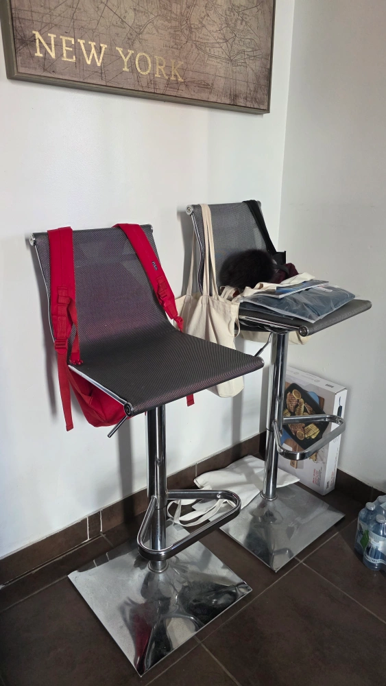 Selling a set of two sleek bar stools. They feature a durable mesh seat and back with a polished chrome base and gas lift for adjustable height. Perfect for a kitchen island or home bar. Easy to wipe clean!