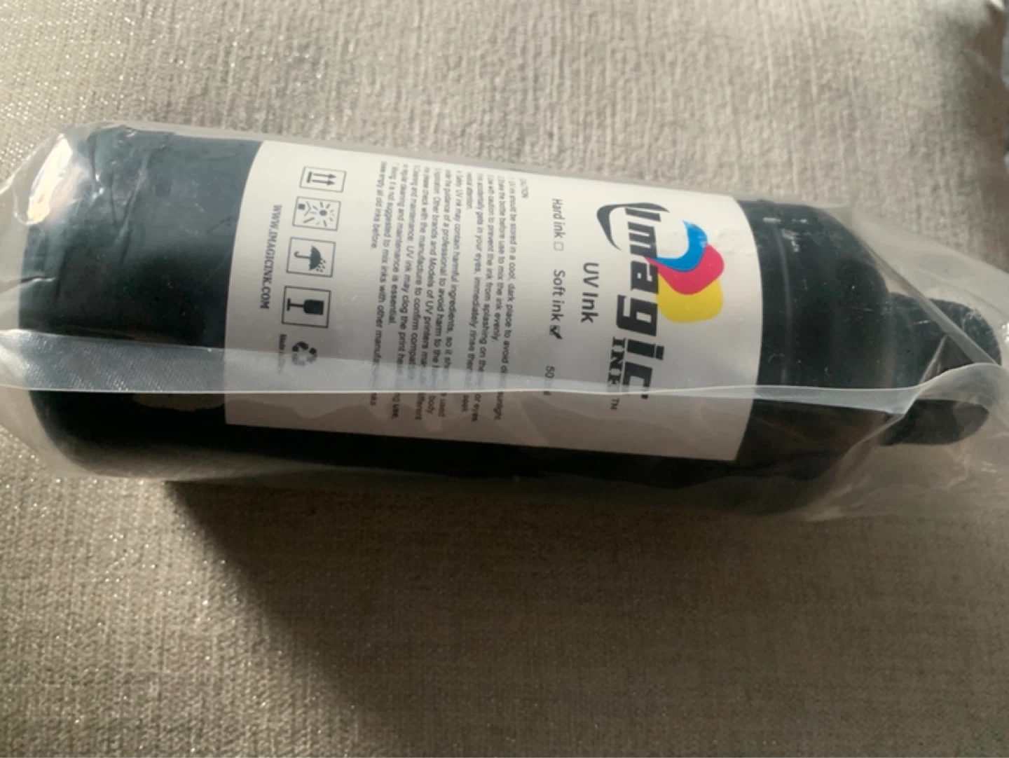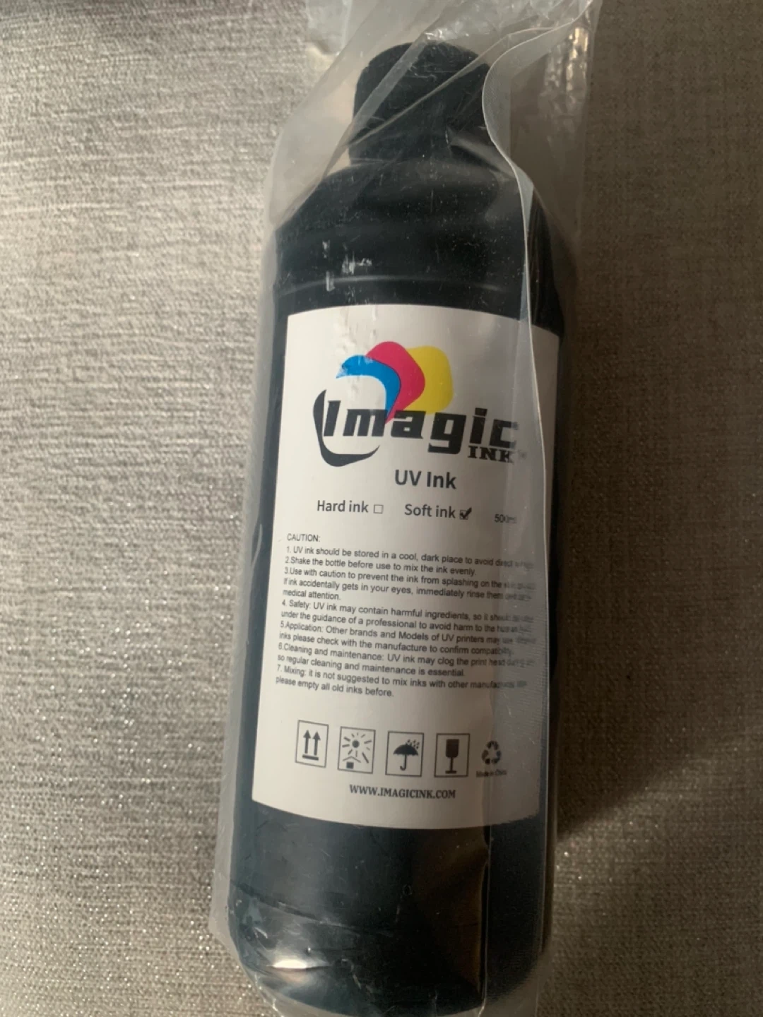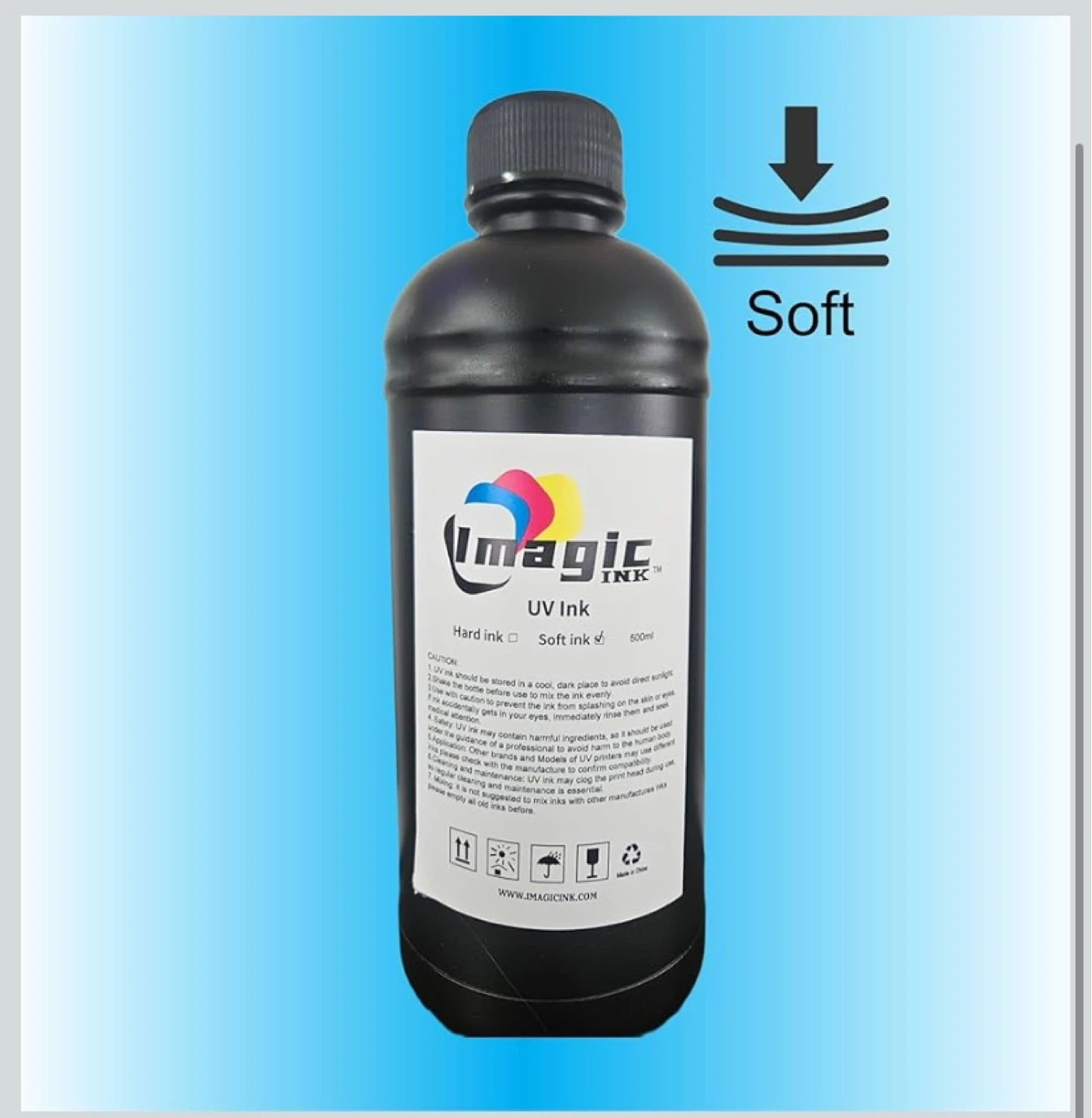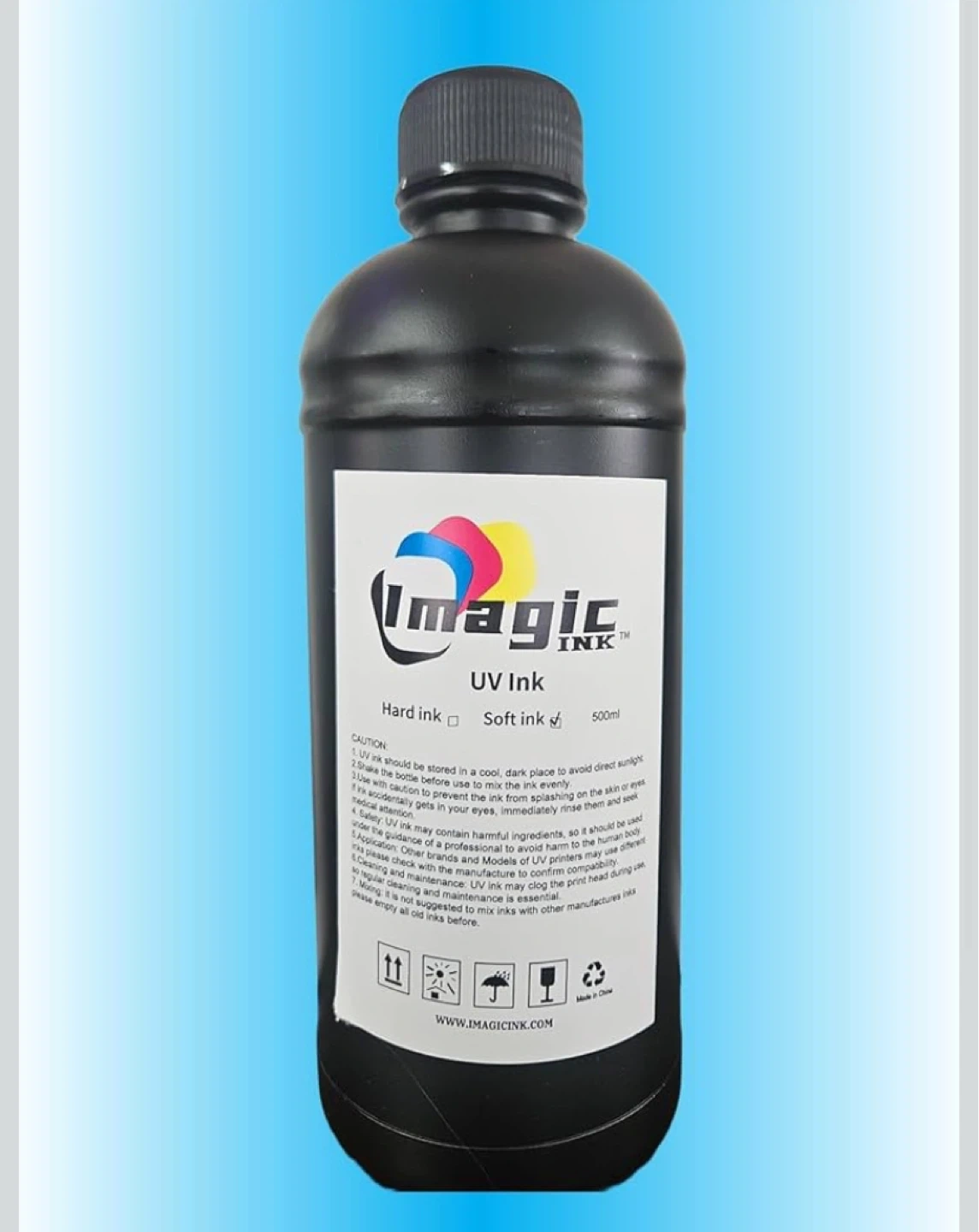 Imaginc brand UV ink in soft formulation. It's a 500ml bottle. Always store in a cool, dark place and shake before use.