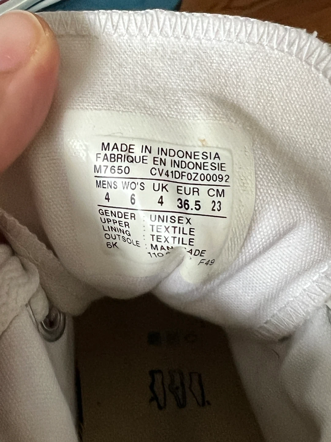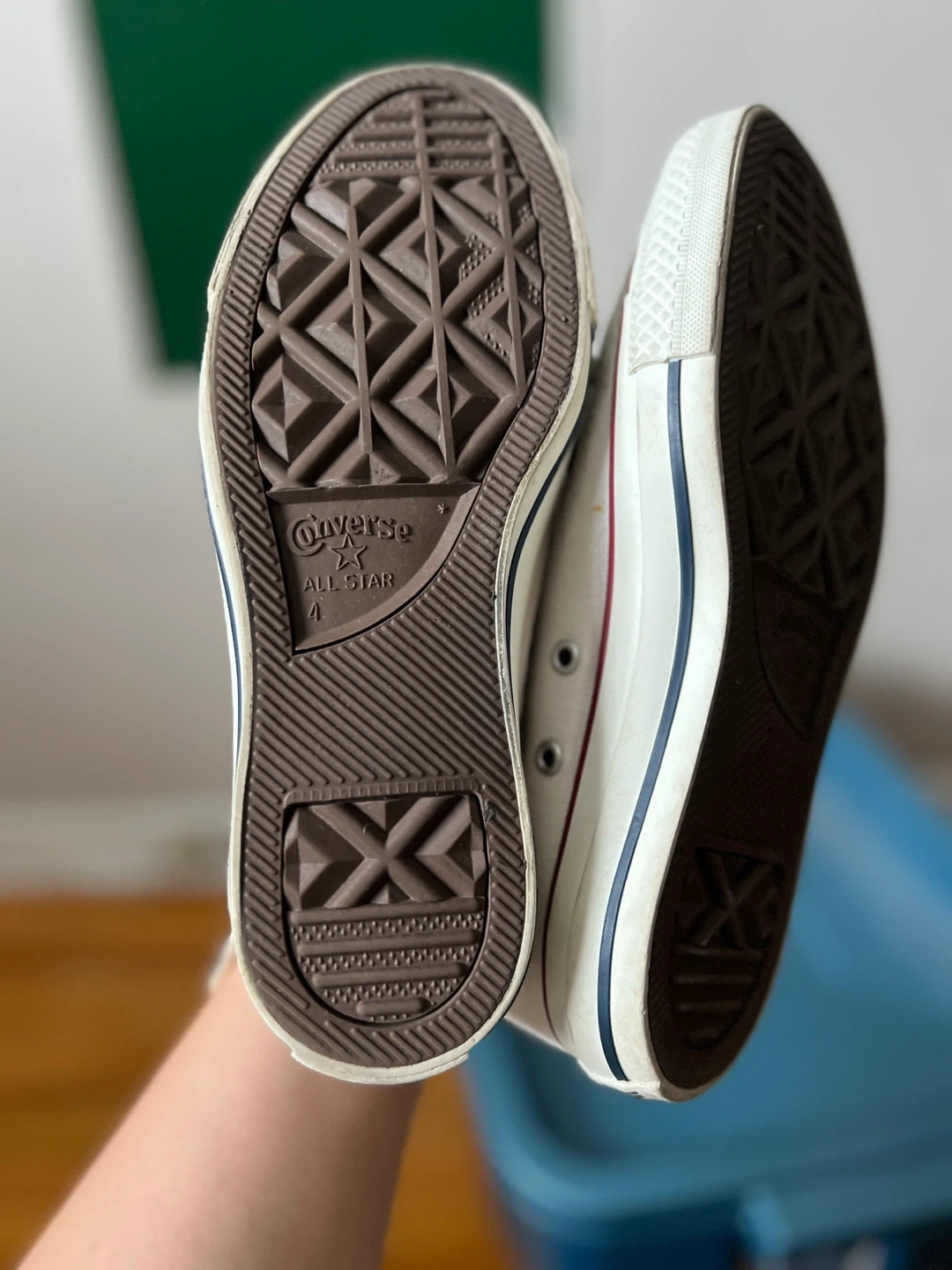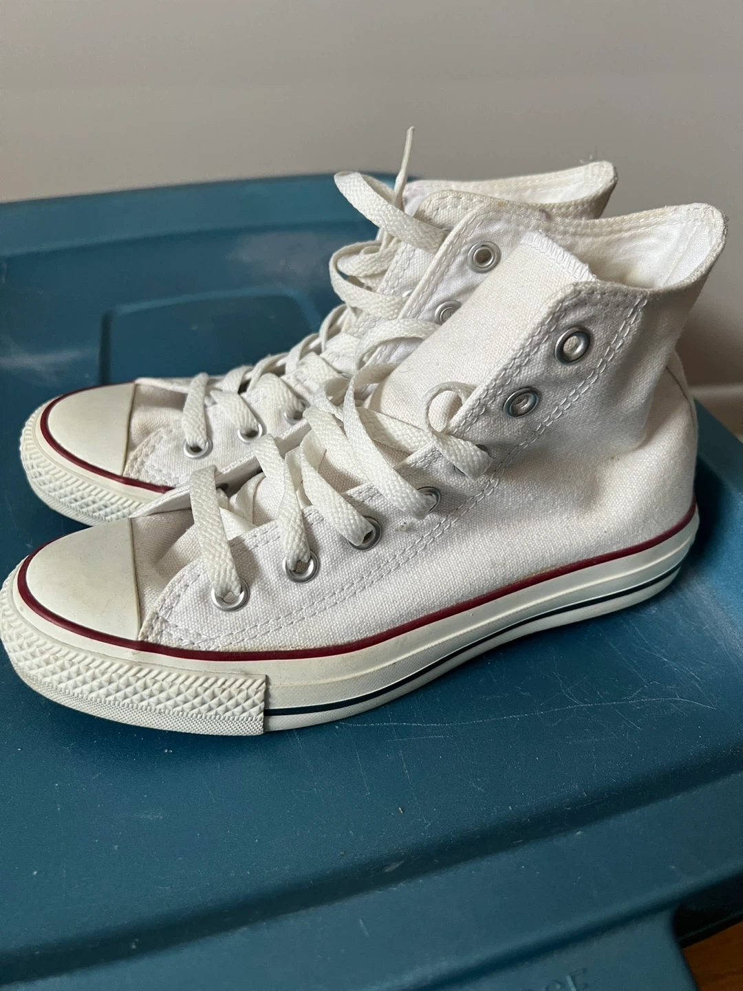 Selling a pair of classic Converse All Star high tops in white. They are a women's size US 6 / UK 4 / EUR 36.5 / CM 23. The upper and lining are made of textile, and the outsole is made of man-made material. They're in great shape and ready for a new adventure!