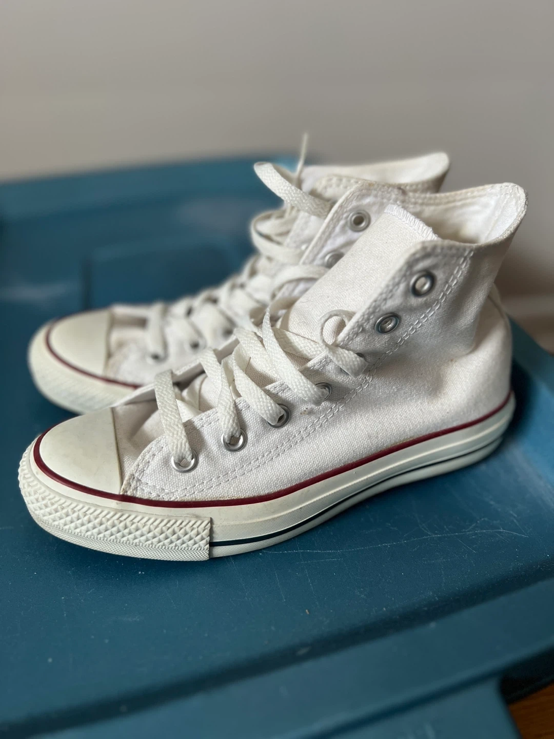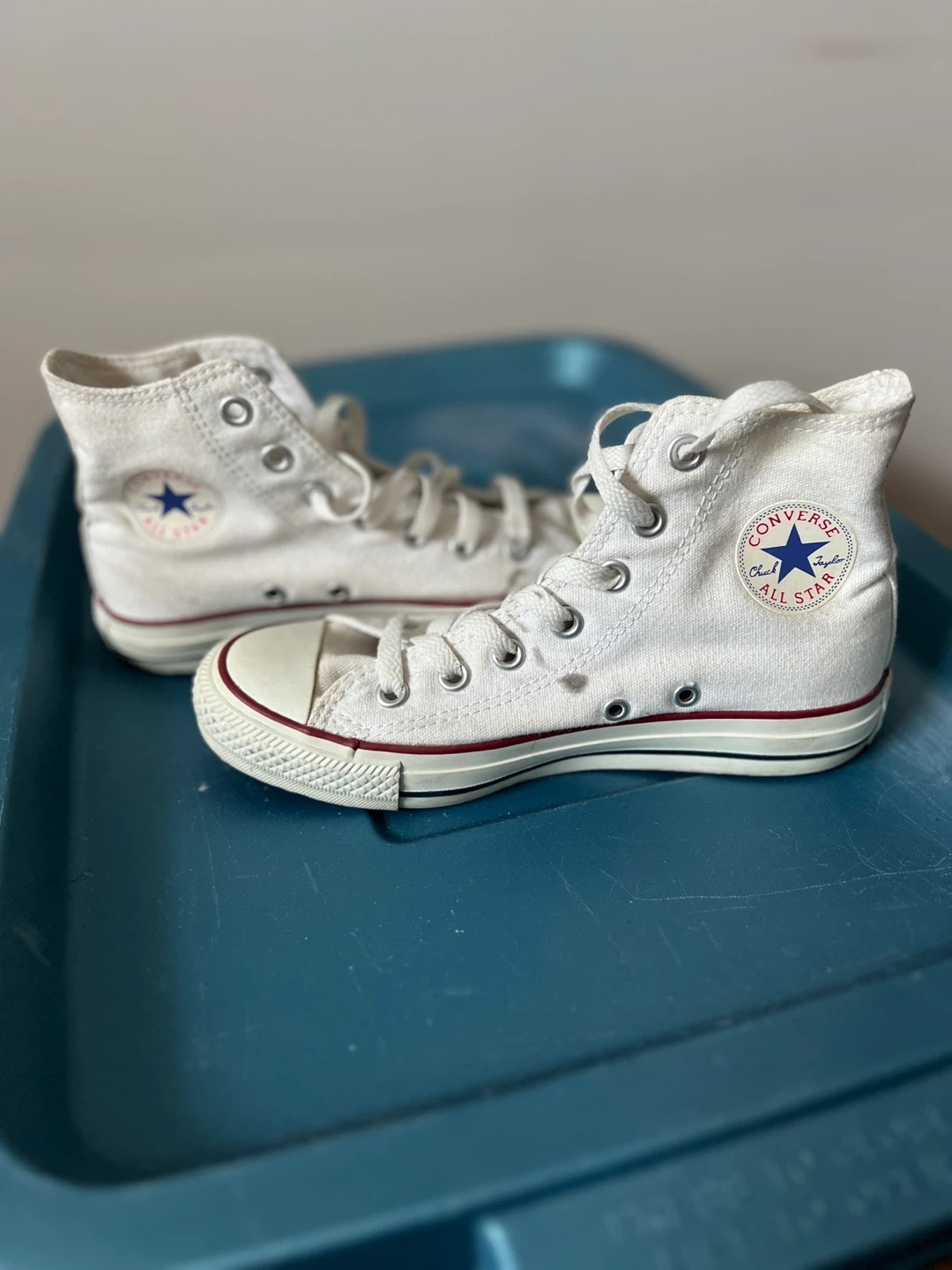Selling a pair of classic Converse All Star high tops in white. They are a women's size US 6 / UK 4 / EUR 36.5 / CM 23. The upper and lining are made of textile, and the outsole is made of man-made material. They're in great shape and ready for a new adventure!