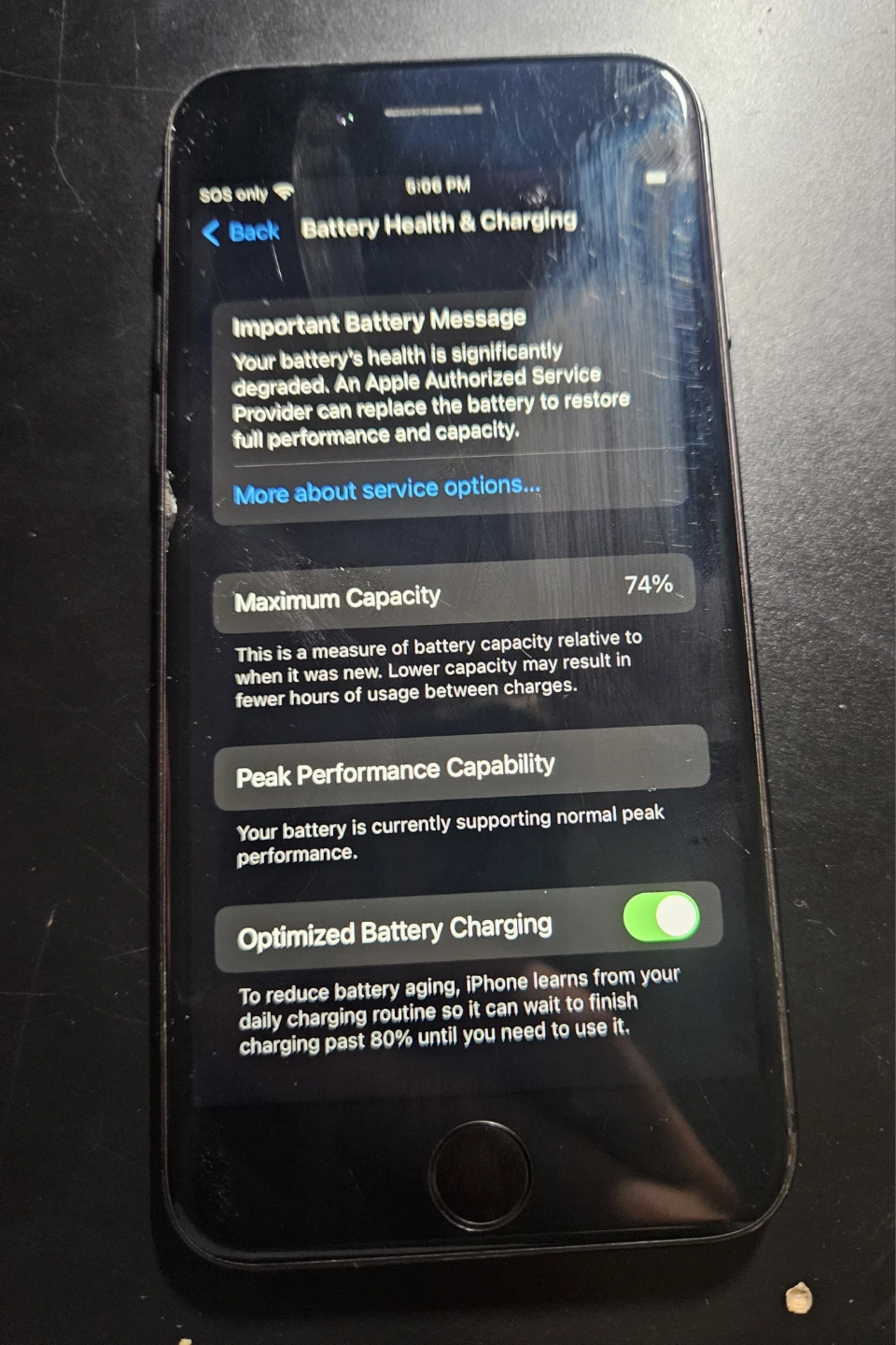 battery health: 74%. Storage 64GB. Has a small Crack near the edge as shown in photo. Overall in good working condition.