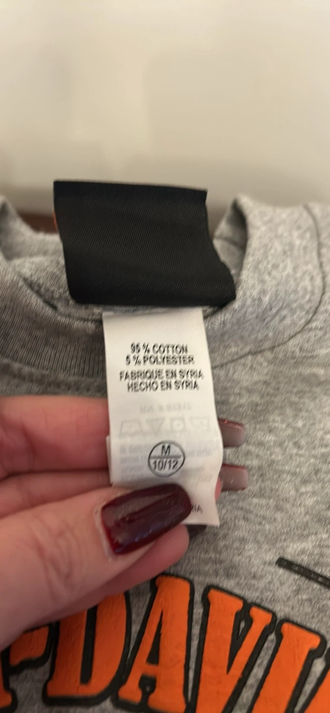This grey long sleeve shirt features a Harley-Davidson motorcycle graphic on the front and sleeve. It's made of 95% cotton and 5% polyester. The size is Youth Medium, fitting a 10/12.