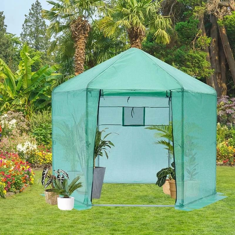 Brand new in box walk-in hexagonal greenhouse with a reinforced metal frame and durable waterproof cover. Features zippered roll-up door, UV protection, and strong insulation—perfect for extending your growing season.