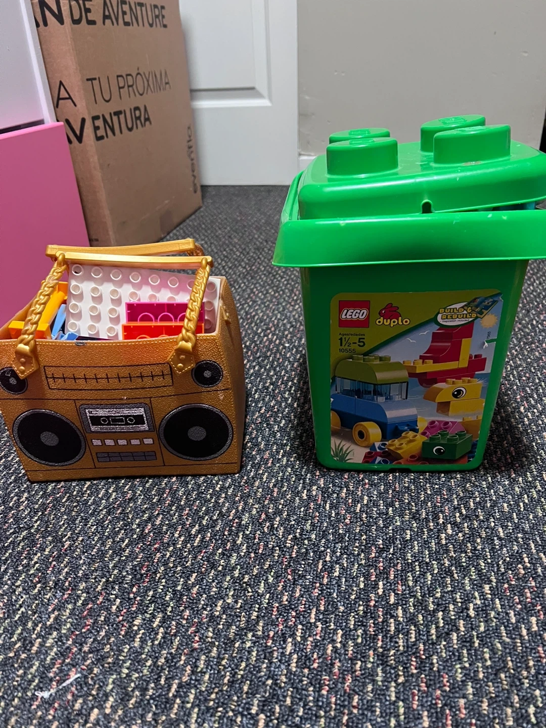 Includes a LEGO Duplo bucket filled with blocks and a gold boombox-shaped toy box also containing blocks. Both are great for little builders!