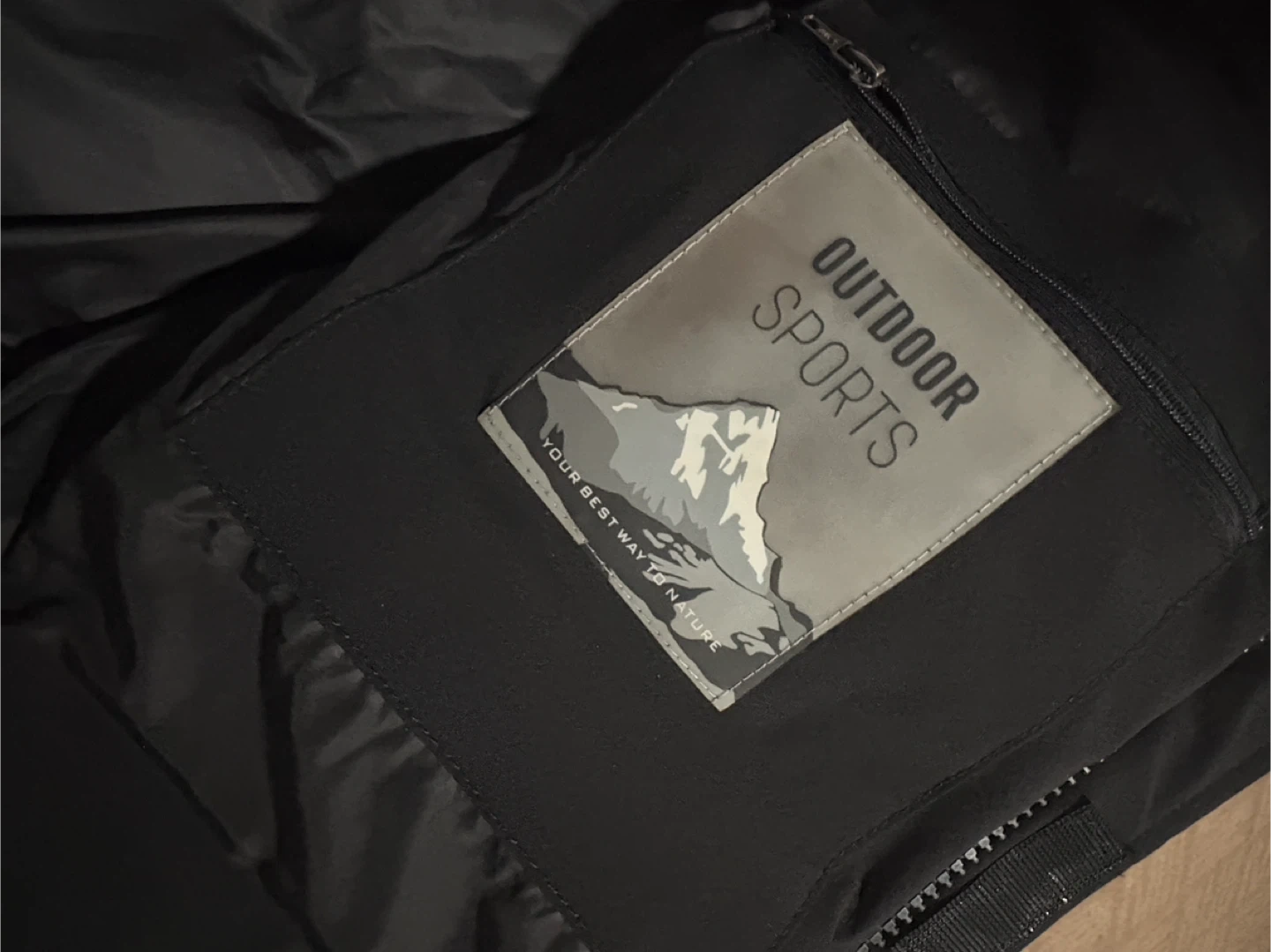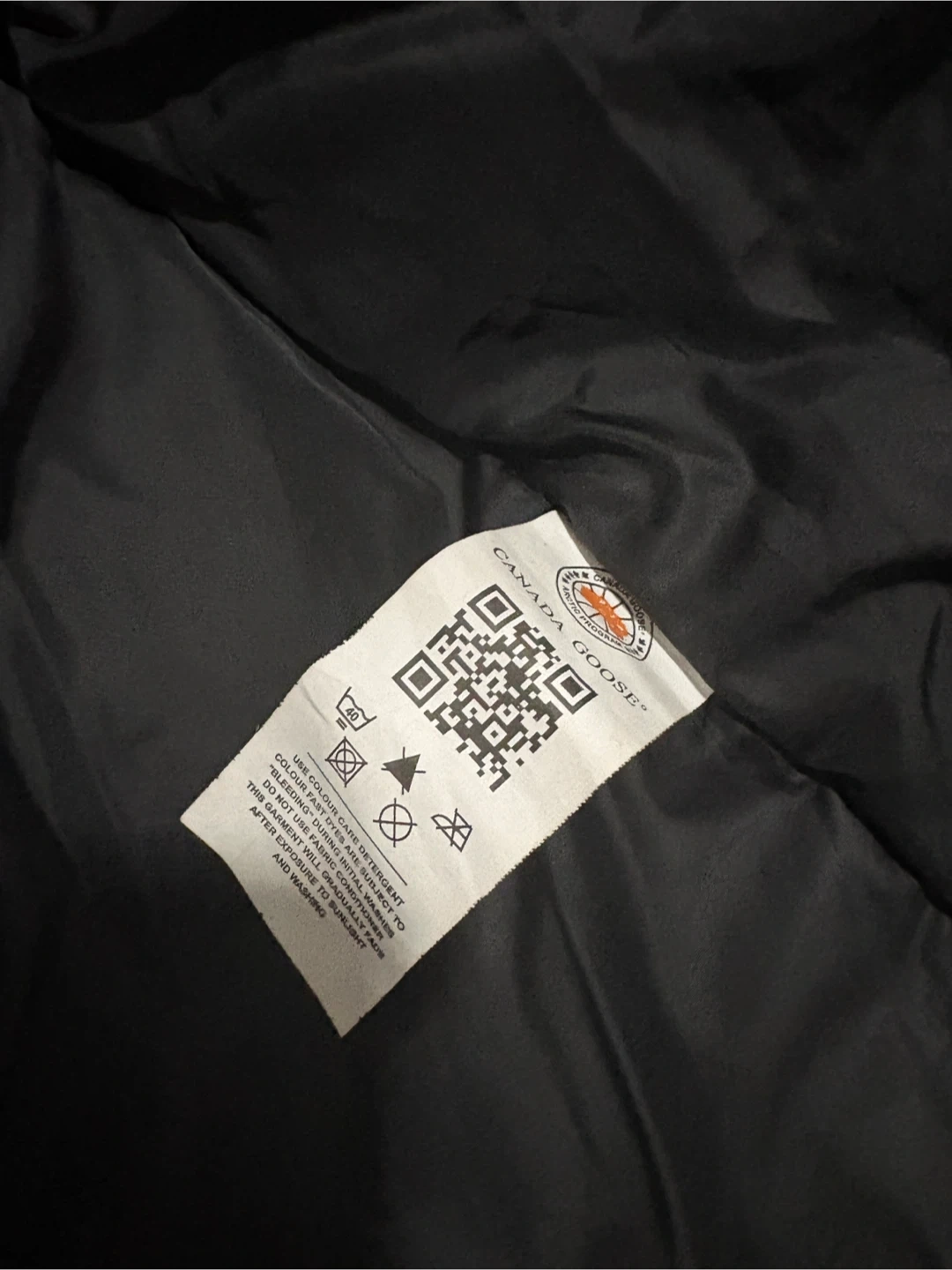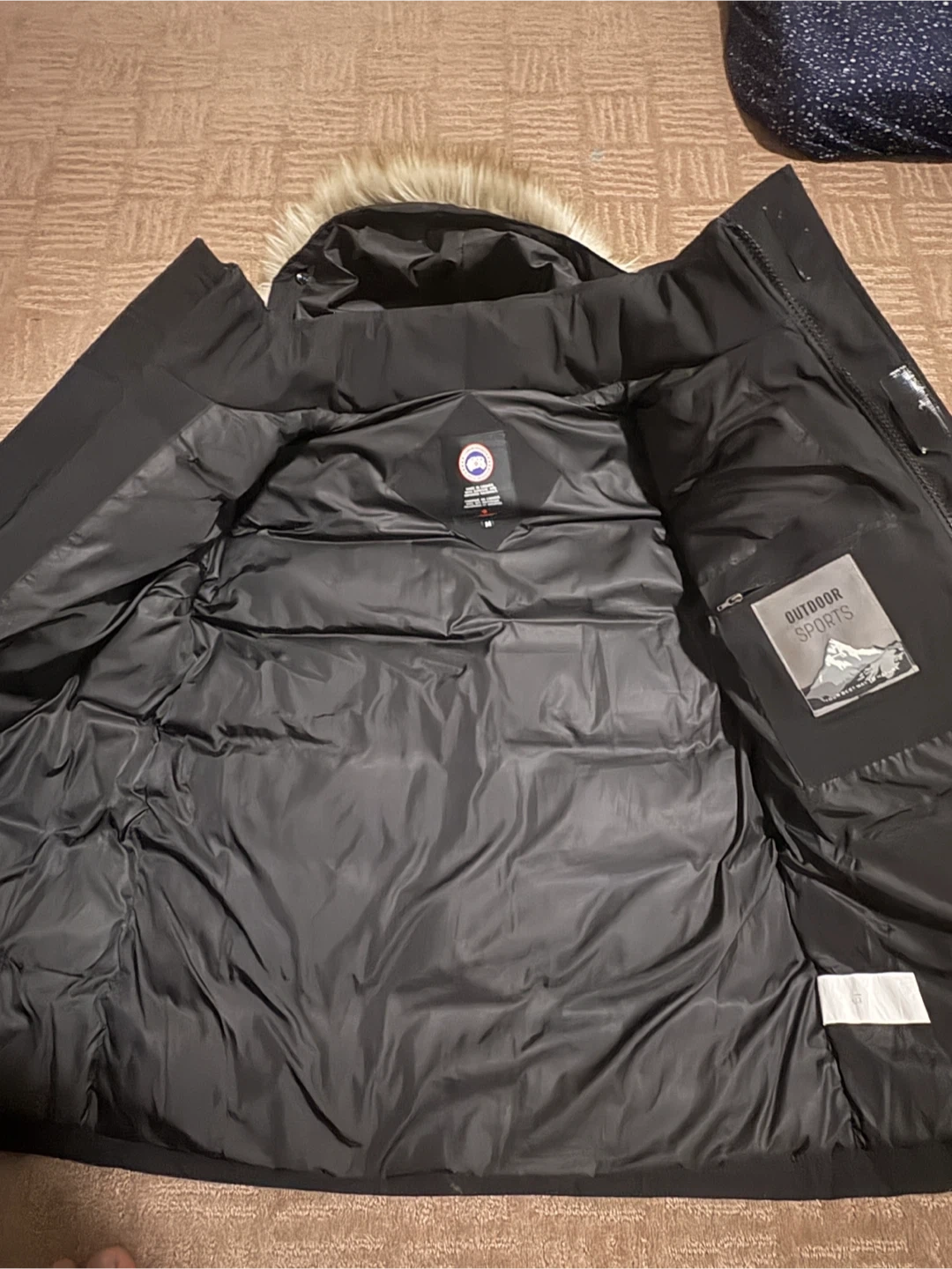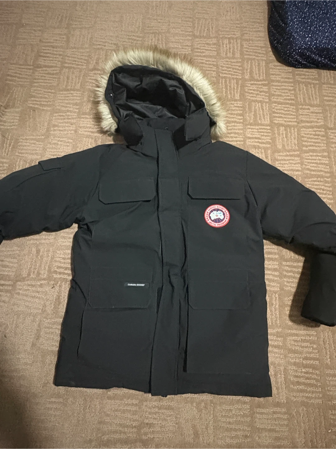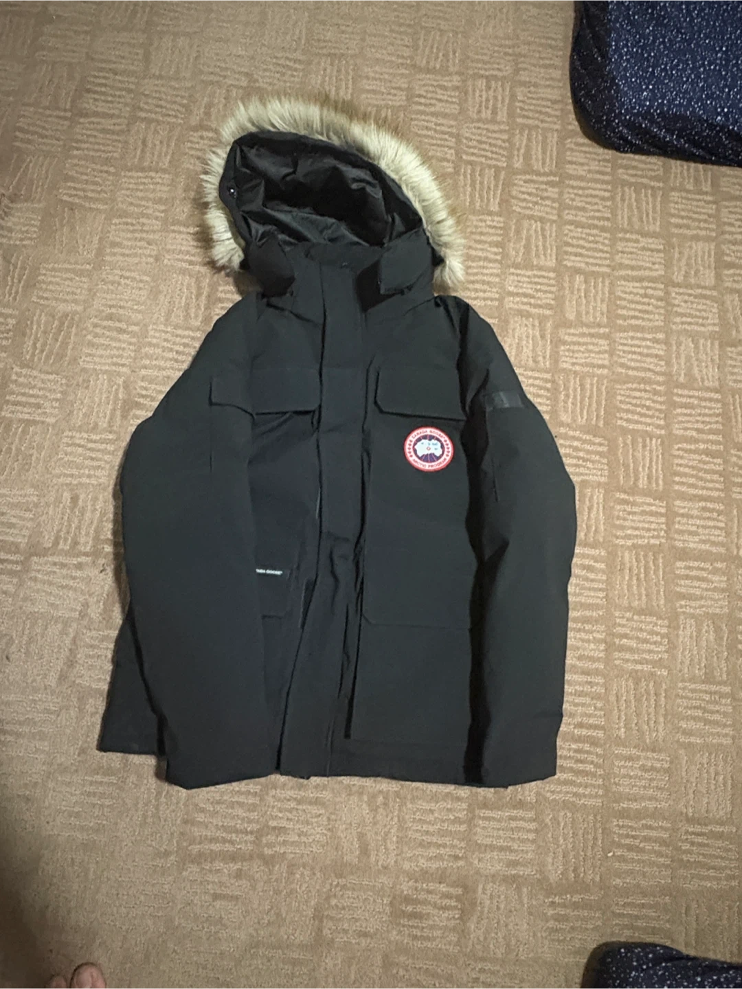 Canada Goose black parka jacket with fur-lined hood. Features multiple pockets and the iconic Canada Goose emblem. It's a warm and durable outerwear piece.