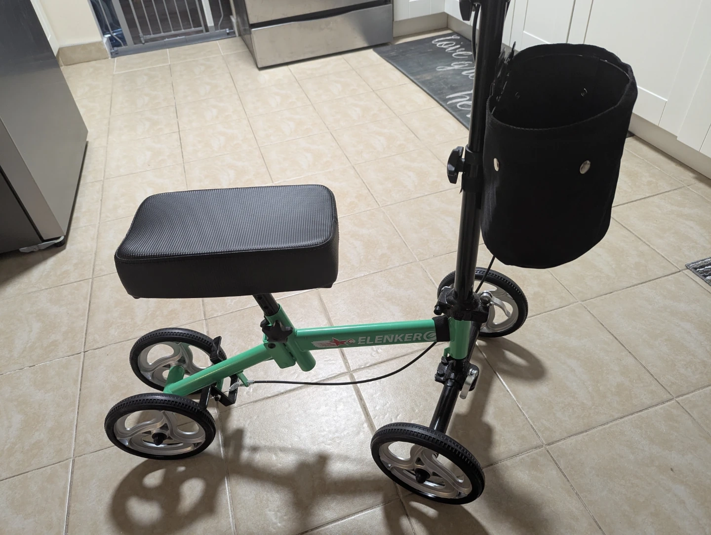 This is an ElengerG knee scooter in green. It comes with a black storage basket attached to the handle. It's designed for mobility assistance. Great for temporary leg injuries!