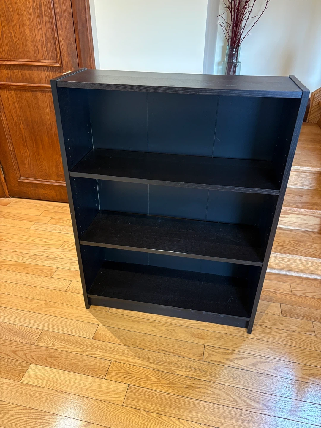 This black bookcase has three shelves. It's made of wood composite. Perfect for organizing books or display items!