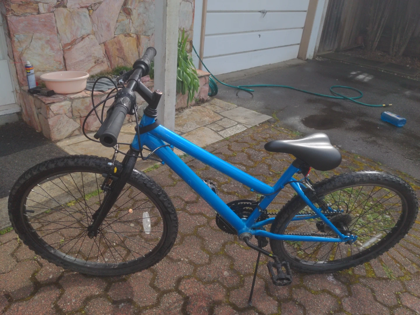 This is a blue kids' mountain bike. It features a sturdy frame and rugged tires for off-road adventures. The bike has a single-speed drivetrain.