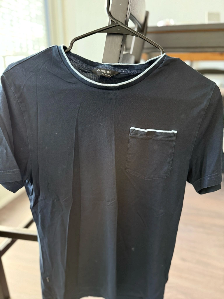 Two men's short-sleeve t-shirts. Light blue and navy. Small chest pocket. Crew neck. Nice quality.