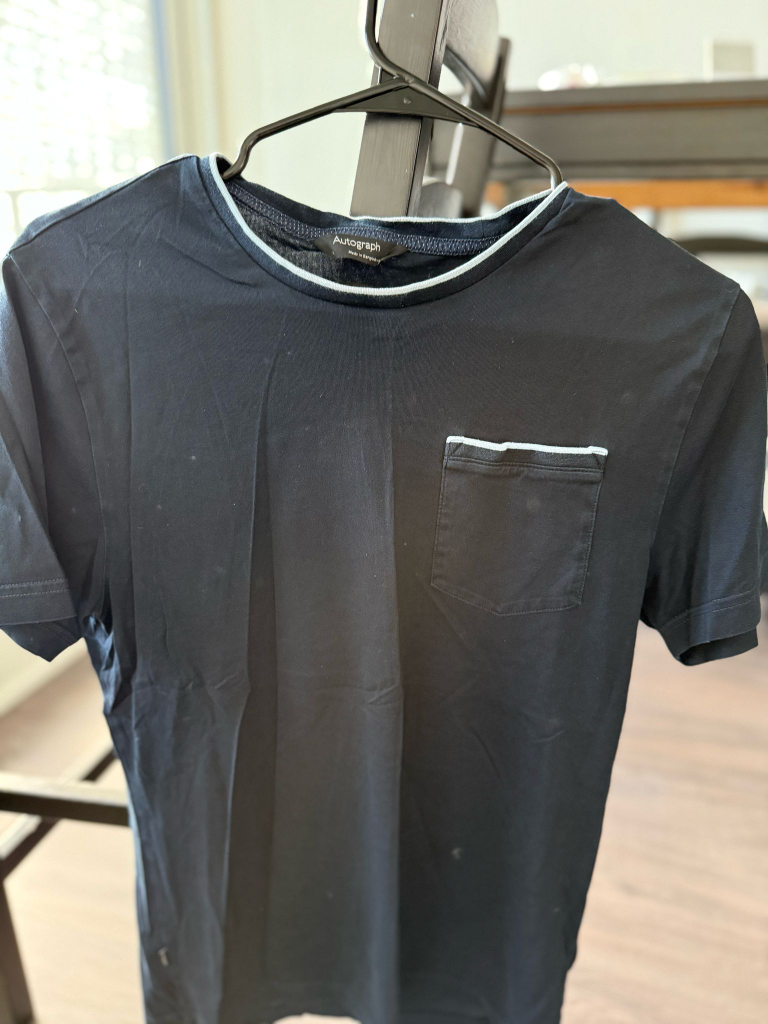 Two men's short-sleeve t-shirts. Light blue and navy. Small chest pocket. Crew neck. Nice quality.