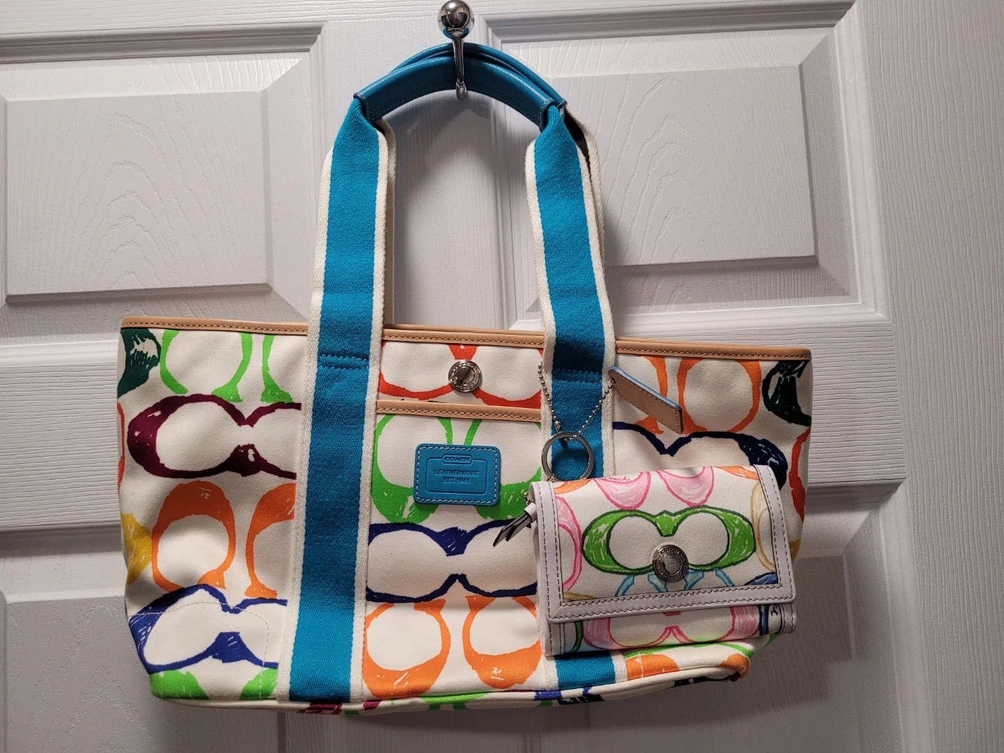 Selling a Coach tote bag that comes with a matching wallet! The bag has a colourful design and sturdy blue straps. It's in great condition and ready for a new owner. Perfect for carrying your essentials in style!