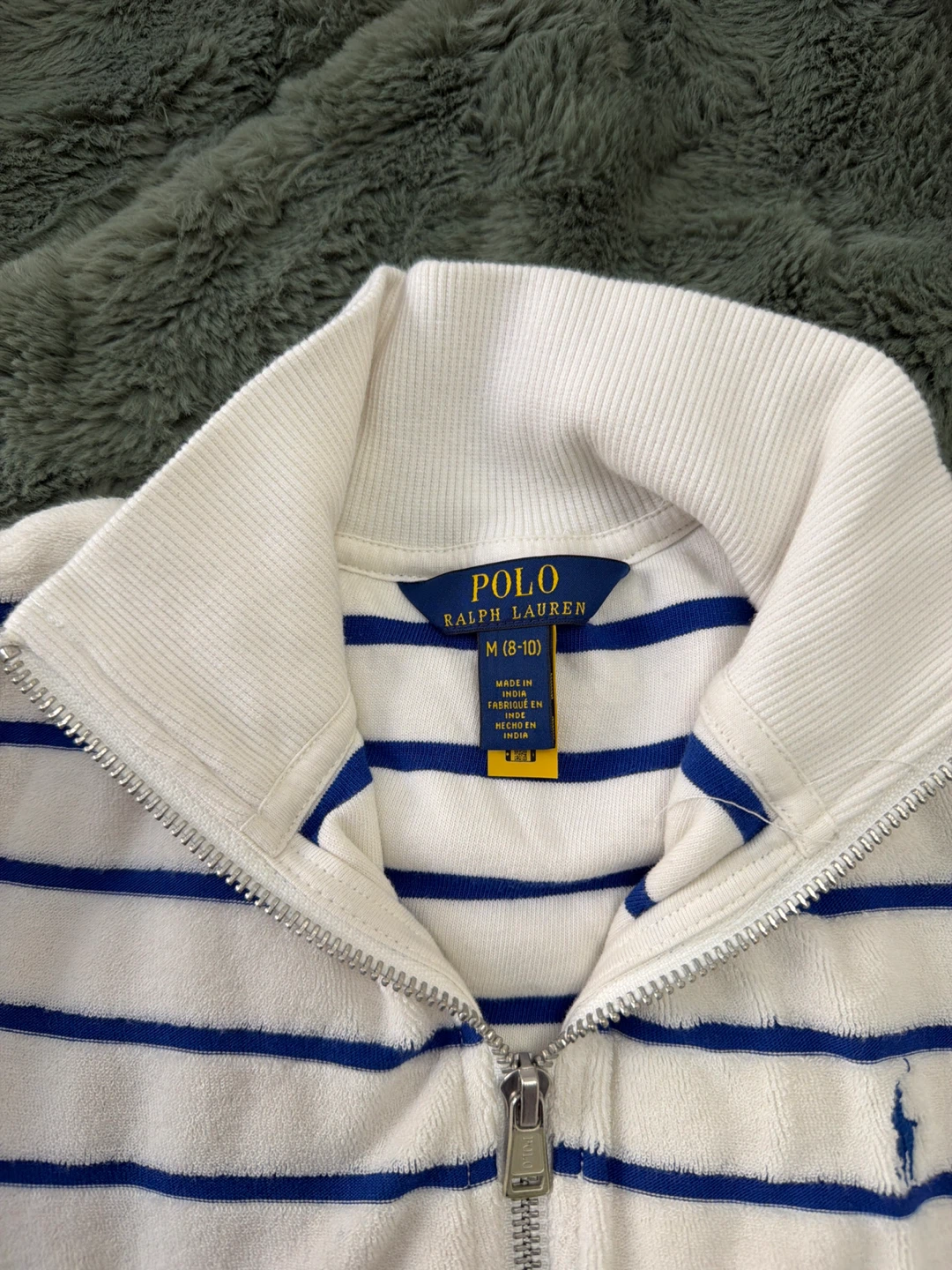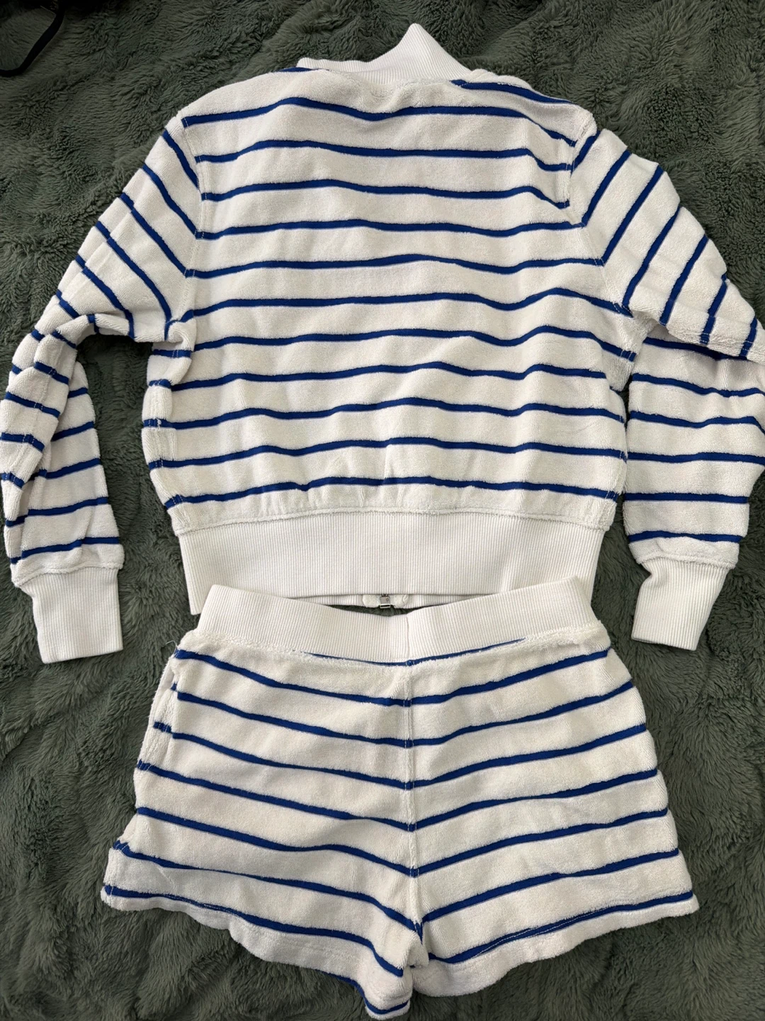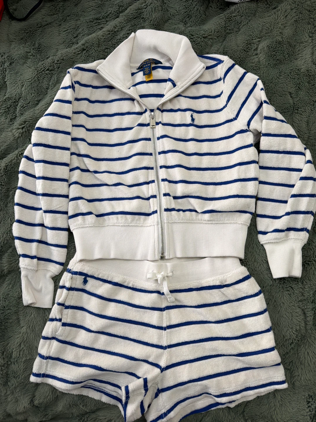 This Polo Ralph Lauren tracksuit set features a white terry cloth fabric with blue stripes. It includes a zip-up jacket and matching shorts. Size M (8-10).