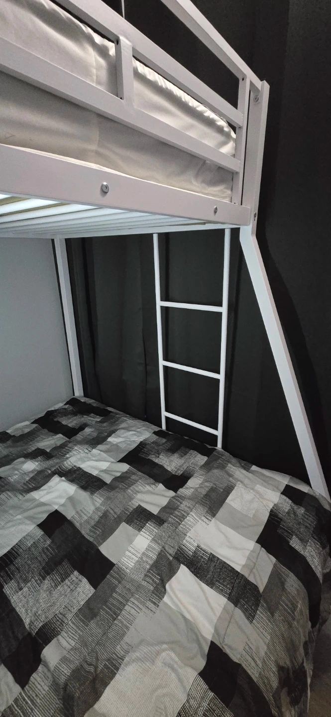 This white metal bunk bed is perfect for saving space. It has a sturdy metal frame and includes a ladder for easy access to the top bunk. The bottom bunk is a double size, and the top bunk is a single size. The beds have guardrails for safety. Mattress not included