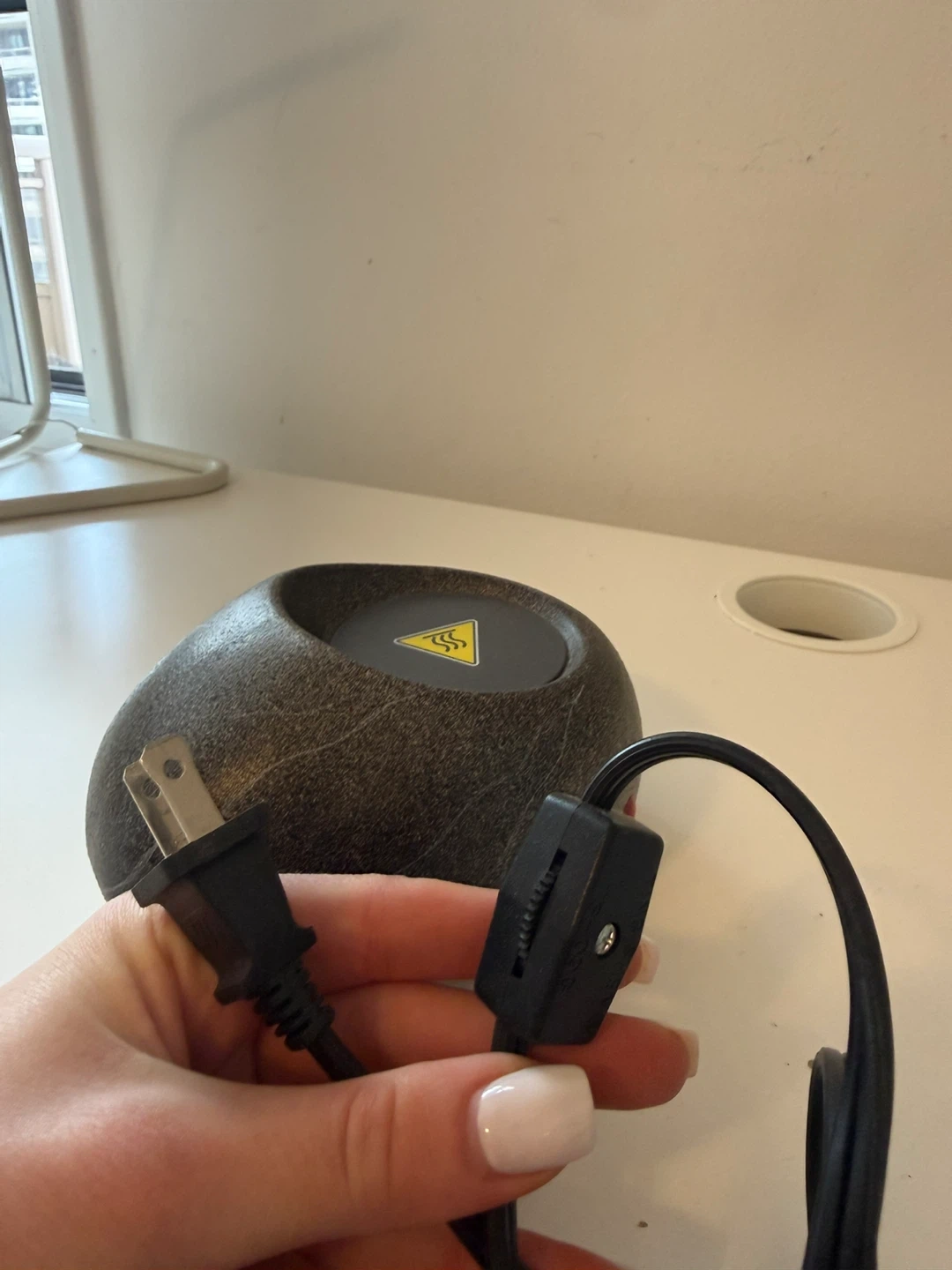 Electric cup warmer with a stone-like appearance. It comes with a power cord and an inline switch. Great for keeping tea/coffee warm outside in a cold weather or while working on the desk. Was never used so in a perfect condition.
