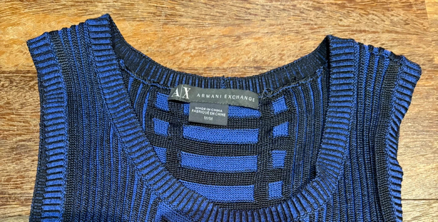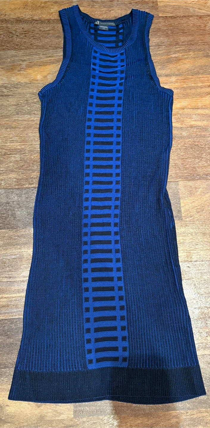 This is a stylish Armani Exchange dress in a striking blue and black pattern. It's a size M/M, as indicated on the tag. The dress features a unique knit design. Perfect for adding a touch of elegance to your wardrobe!