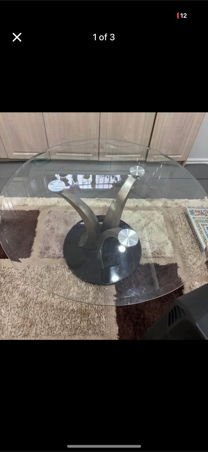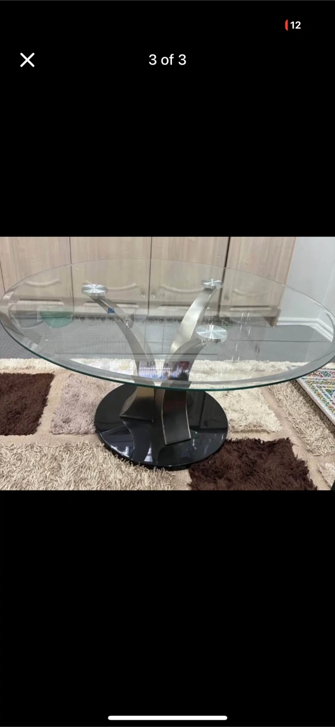 This is a modern glass top coffee table with a sturdy base. It's made with a clear glass top and a dark, possibly wood or laminate, pedestal base. The base has a curved metal accent. It's a nice focal point for a living room.